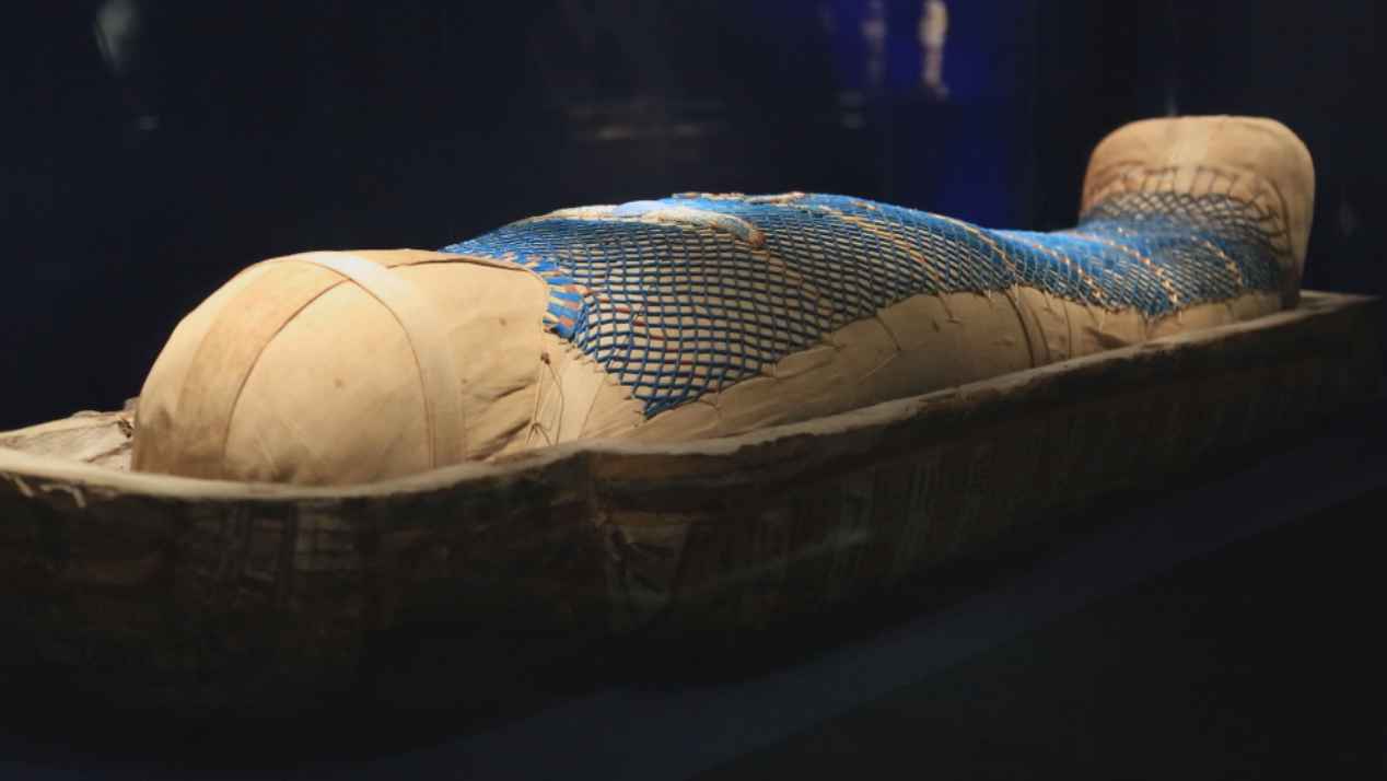 A human mummy shrouded with linen and covered by a net made of pottery. /CGTN Photo
