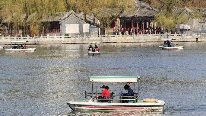 Visitors on a boat in Yuyuantan Park, March 16, 2019 /VCG Photo