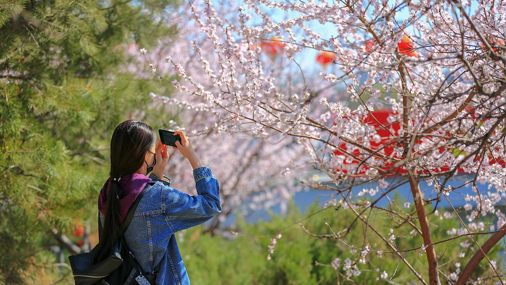 A girl takes pictures of cherry blossoms in Yuyuantan Park. /VCG Photo