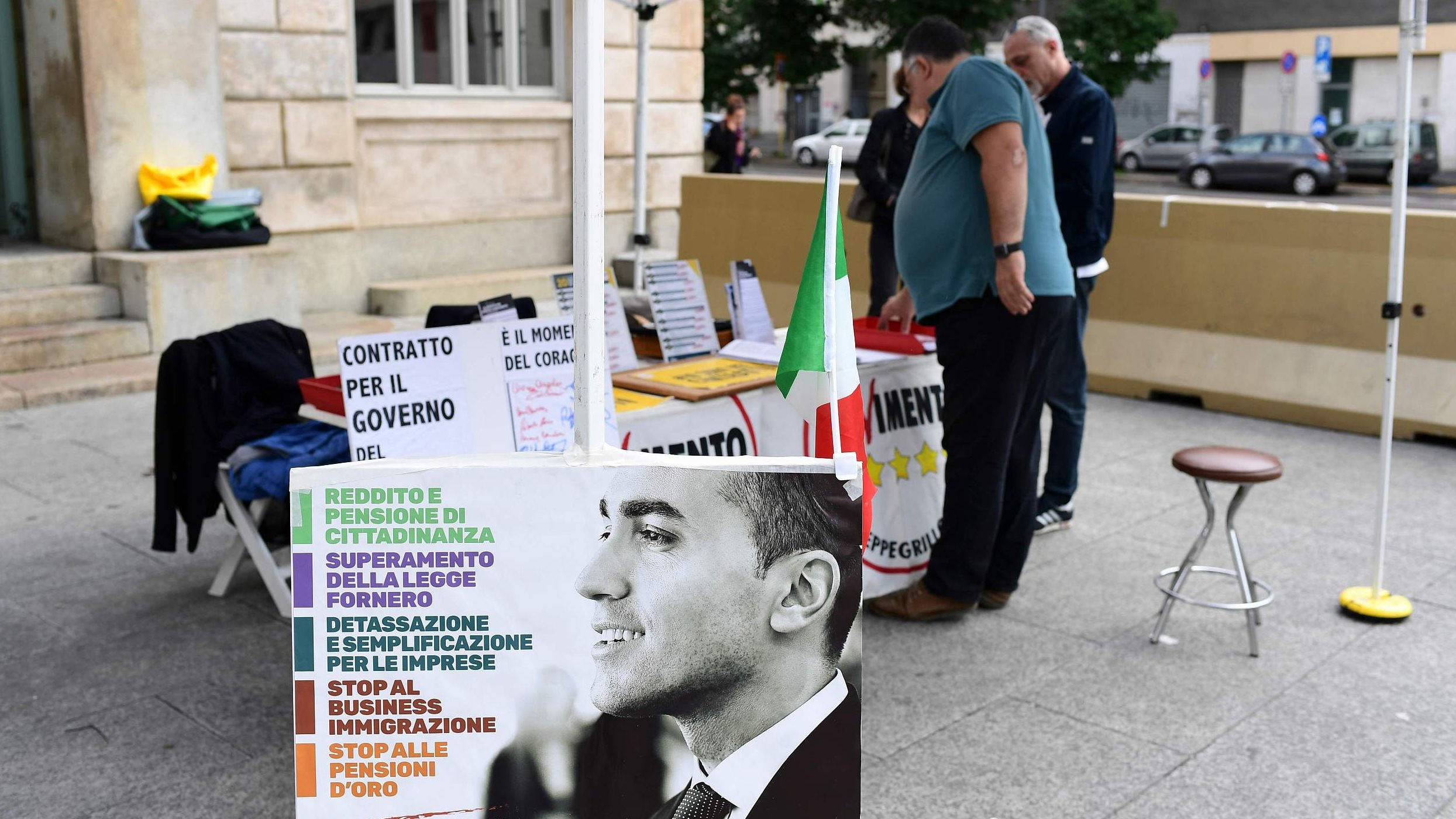 Supporters of anti-establishment Five Star Movement promote a program for government with the far-right League, in Milan, May 20, 2018. /VCG Photo