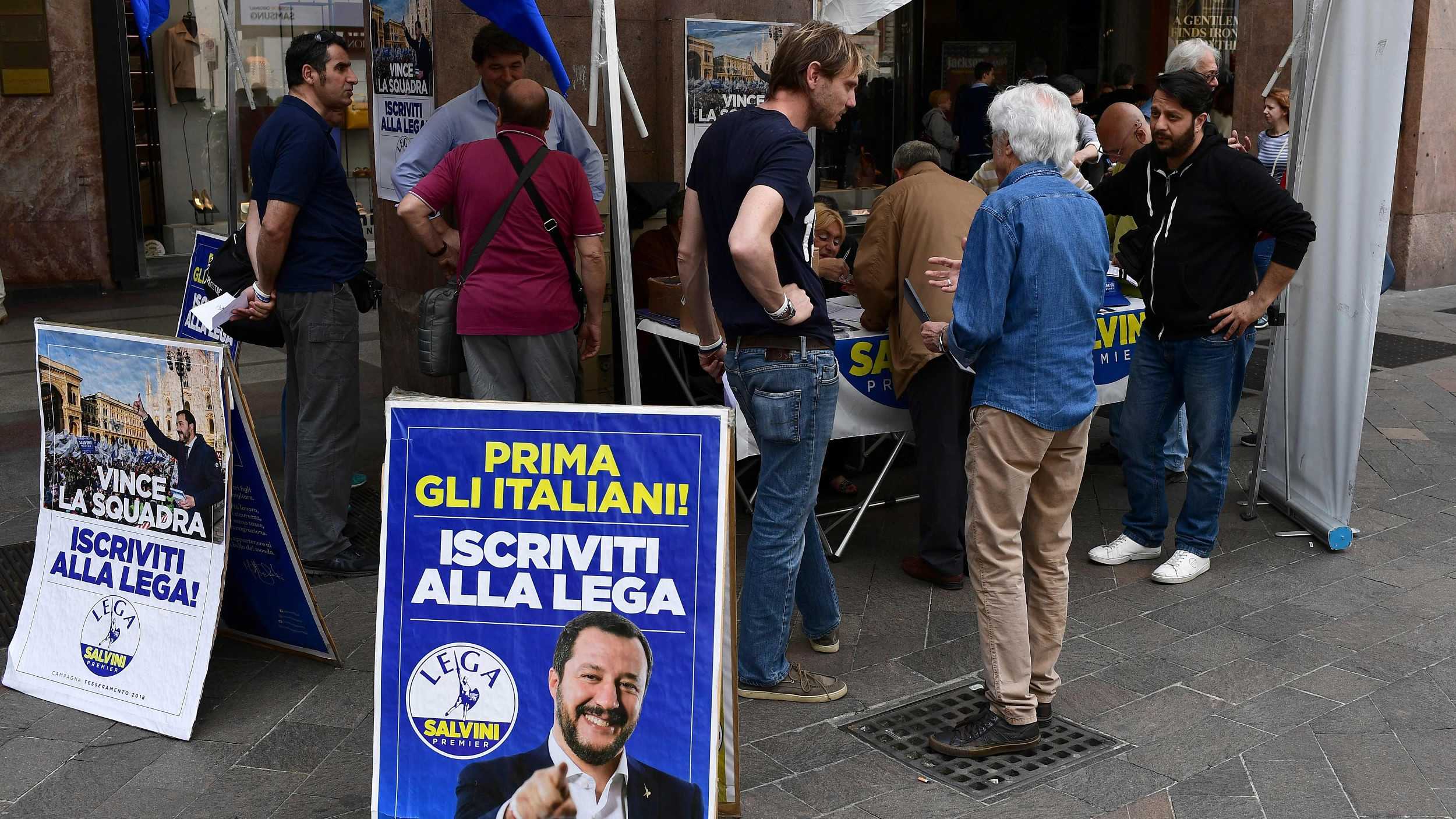 Supporters of the far-right League promote a program for government with the anti-establishment Five Star Movement, in Milan, May 20, 2018. /VCG Photo