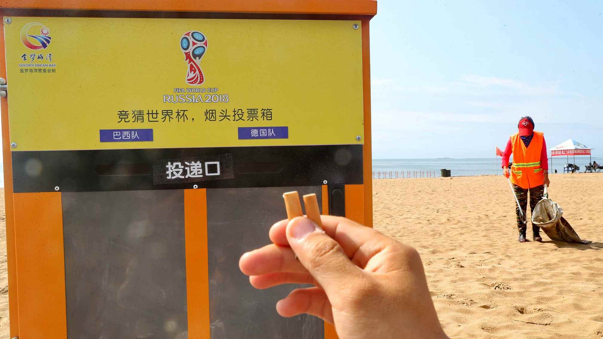 Six cigarette end collection boxes were set up on the seaside of Jinmeng bay in Qinghuangdao City, Hebei Province. The box is divided into two compartments, each labeled with the name the possible winning team of the World Cup 2018. /VCG Photo