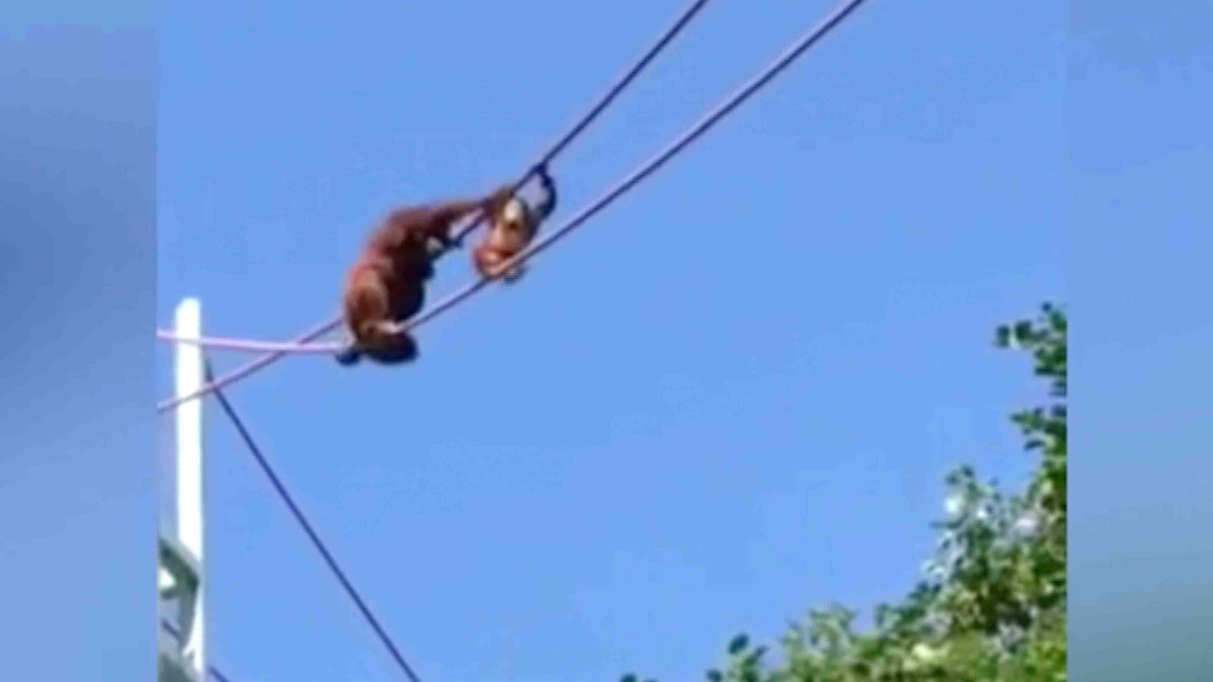 A video captured at Smithsonian's National Zoo in Washington DC on August 23 shows a baby orangutan walking on a rope line followed by its mother, before calling it quits and climbing on the back of the more agile adult.