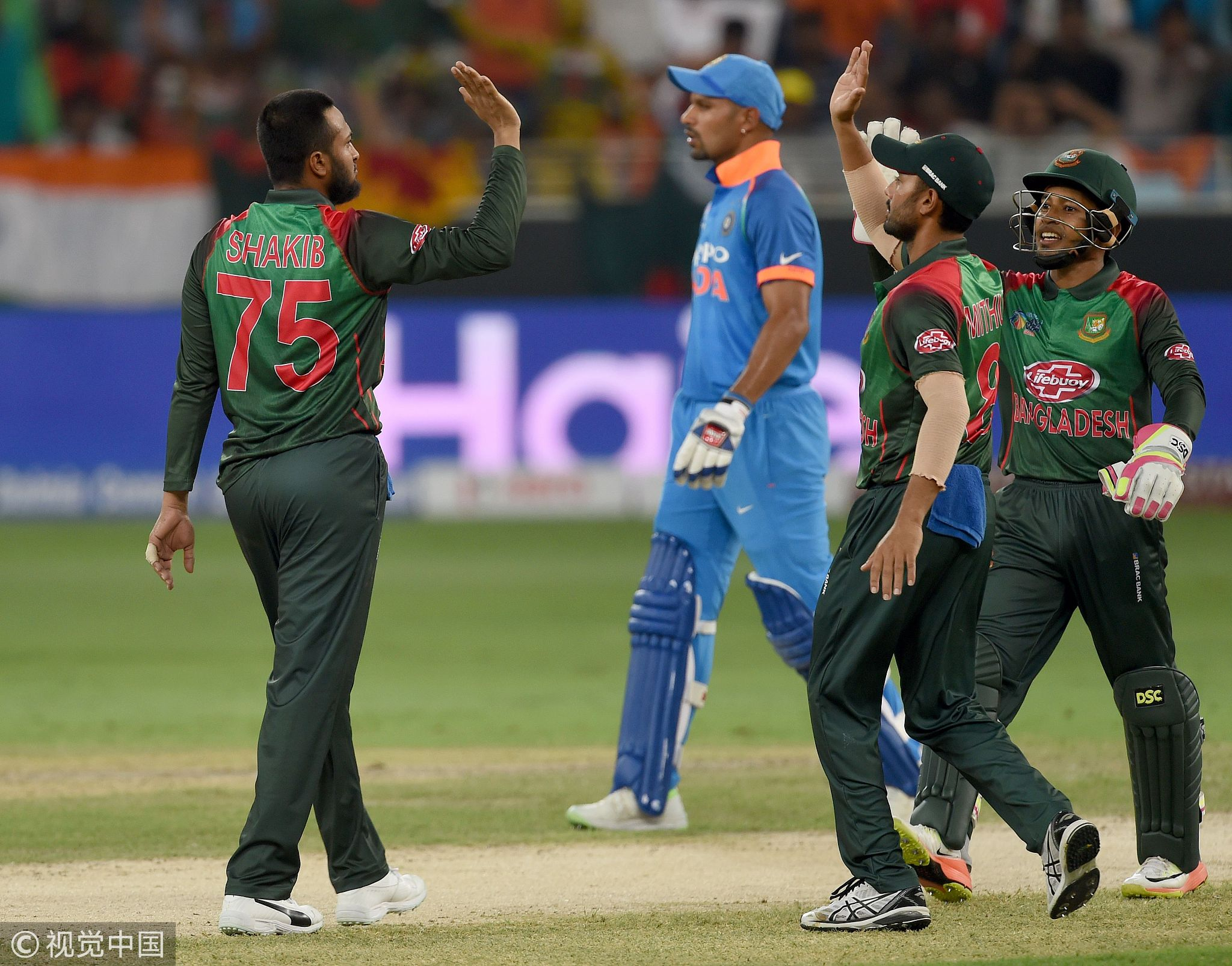 Bangladesh cricketer Shakib Al Hasan (L) celebrates with his teammates after he dismissed Indian batsman Shikhar Dhawan (C), September 21, 2018. /VCG Photo