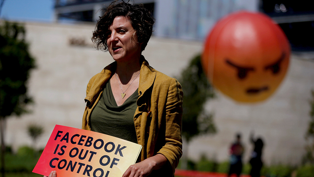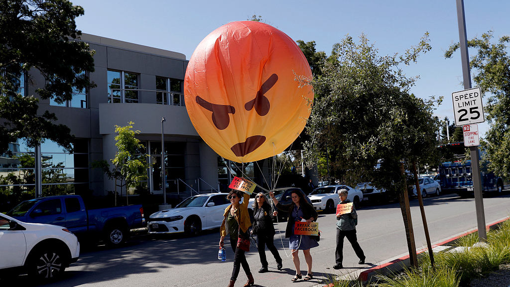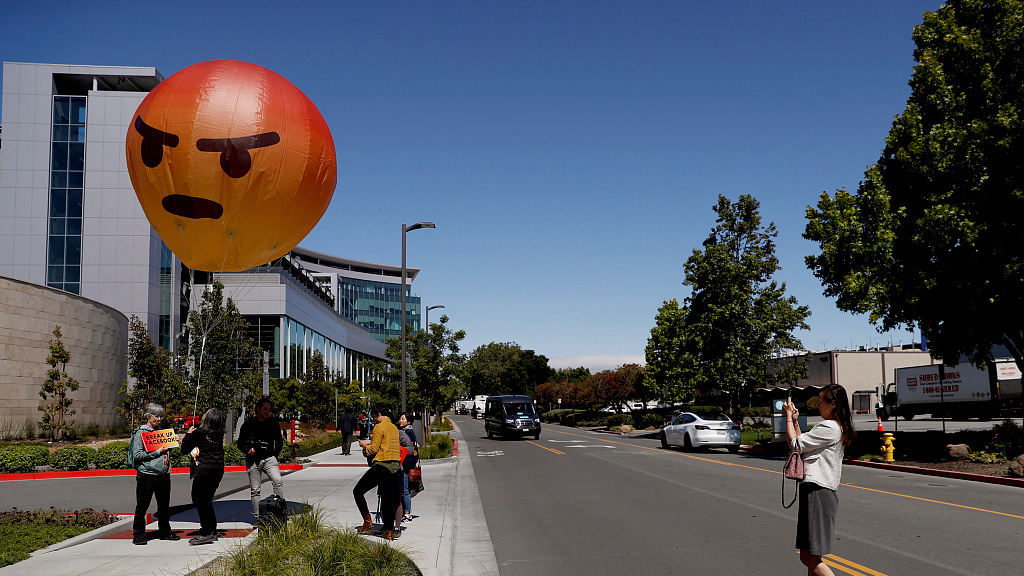 The protesters carrying the 2.5-meter big emoji balloon said the company failed to protect its users, particularly the minorities, from hate speech and other abuses. /VCG Photo