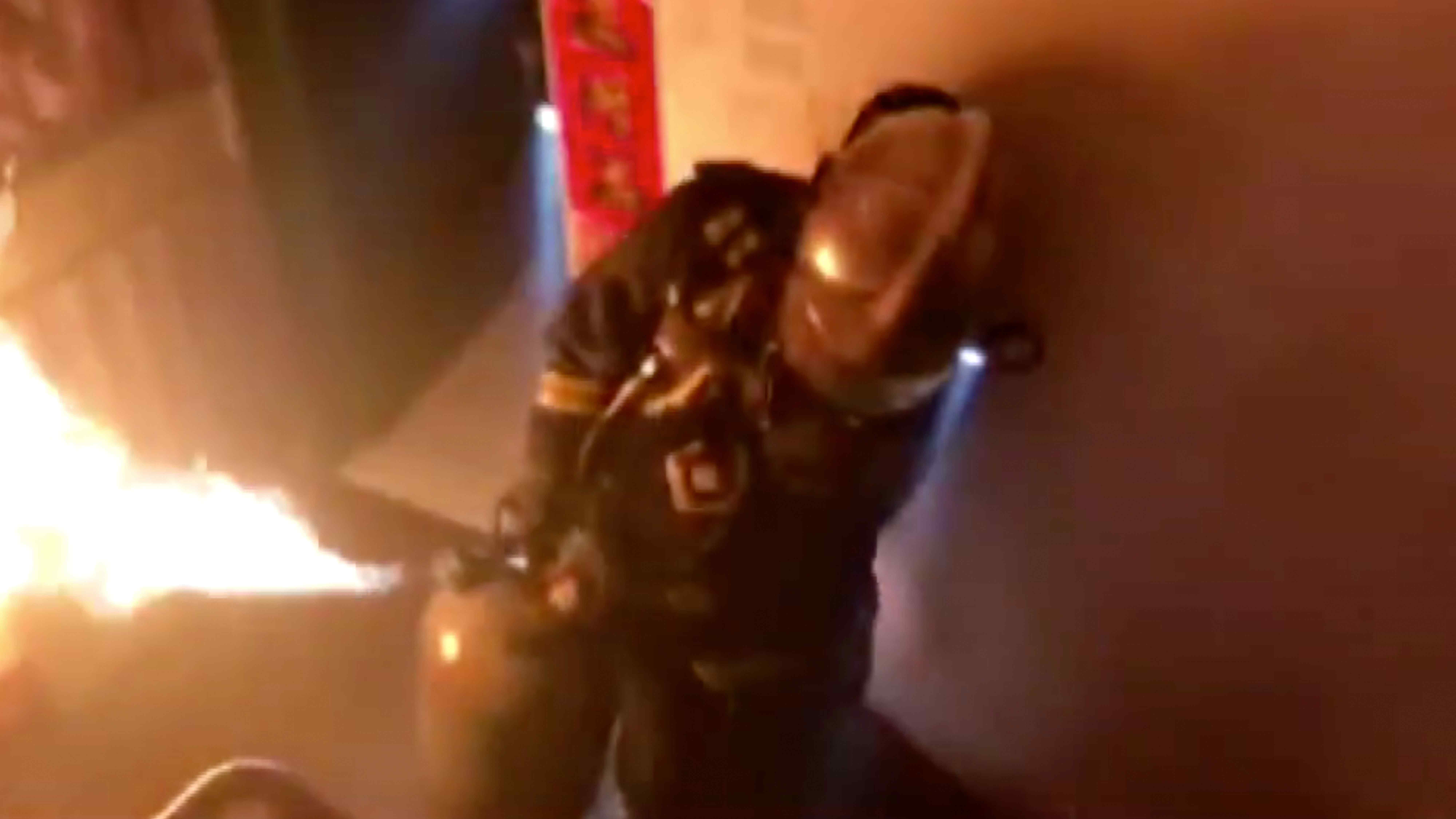 A fireman was caught removing a gas tank by hand from a building in east China’s Shandong Province.