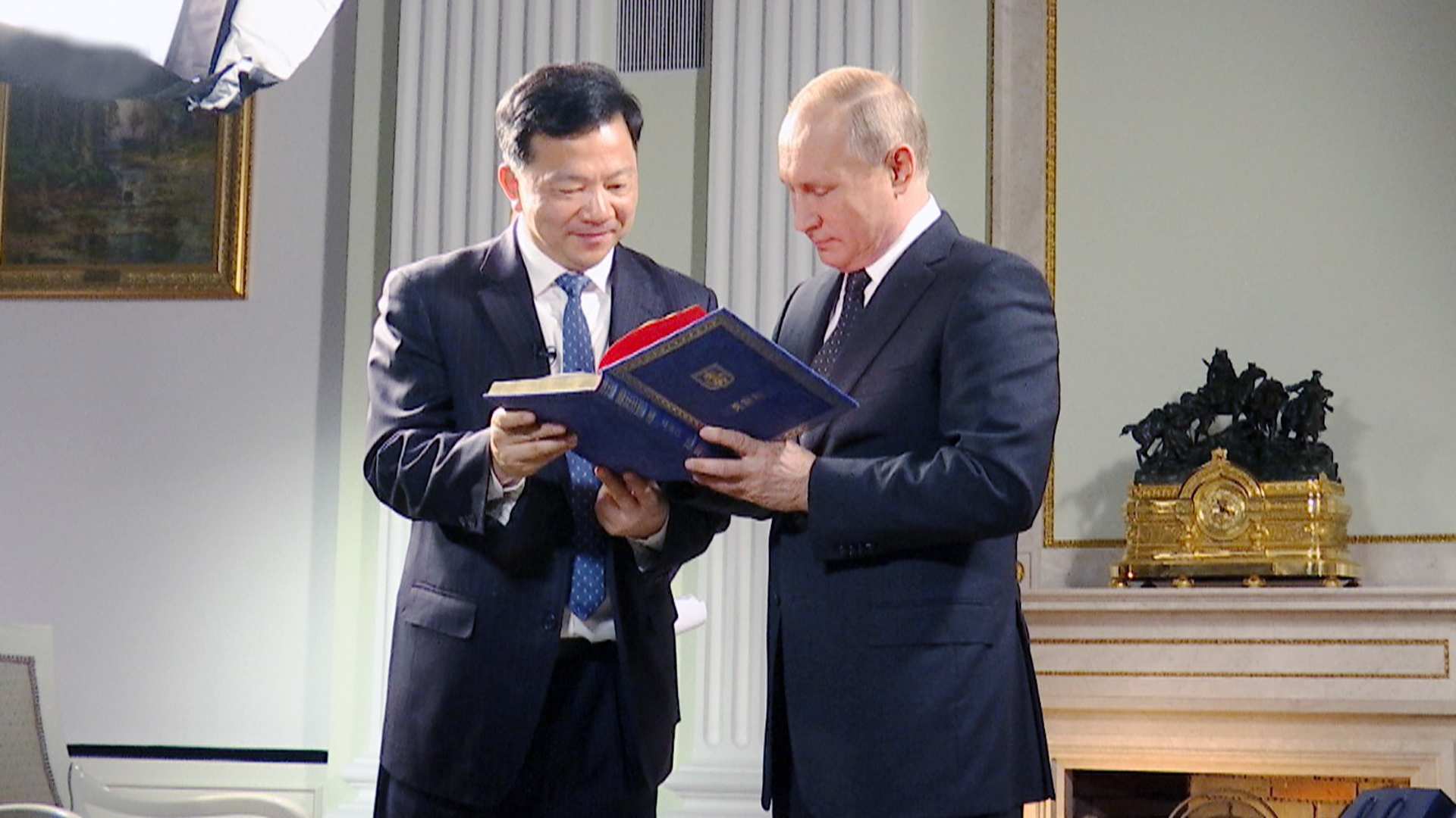 After the exclusive interview with China Media Group's President Shen Haixiong on May 31, at the Grand Kremlin Palace in Moscow, Russia, Shen presented Putin with two cans of West Lake Longjing Tea and a video package of CCTV's four previous interviews with the Russian president. Putin later sent Shen a Chinese-language photo album of Moscow with his signature in return.