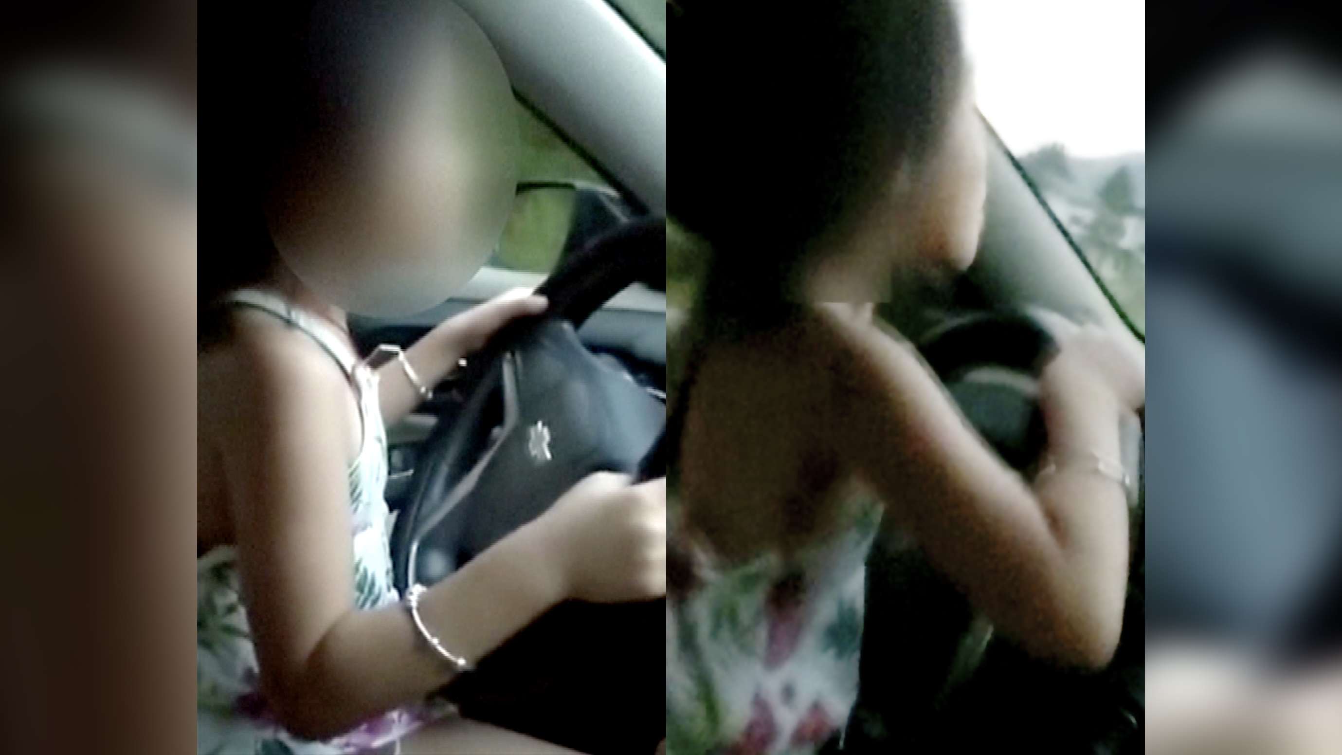 A six-year-old girl drives while her dad sits in passenger's seat recording her. /Screenshot via CGTN