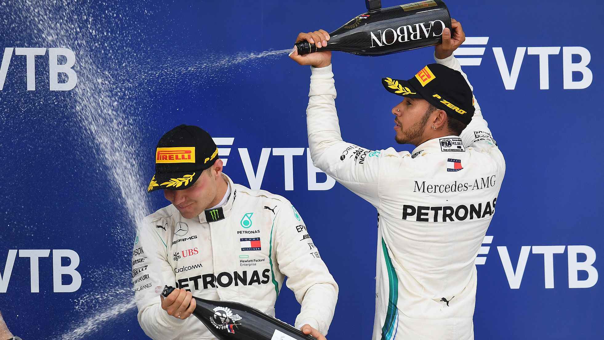 Lewis Hamilton and Valtteri Bottas celebrate on the podium during the Russia Formula One Grand Prix at Sochi Autodrom in Sochi, Russia, on September 30, 2018. /VCG Photo