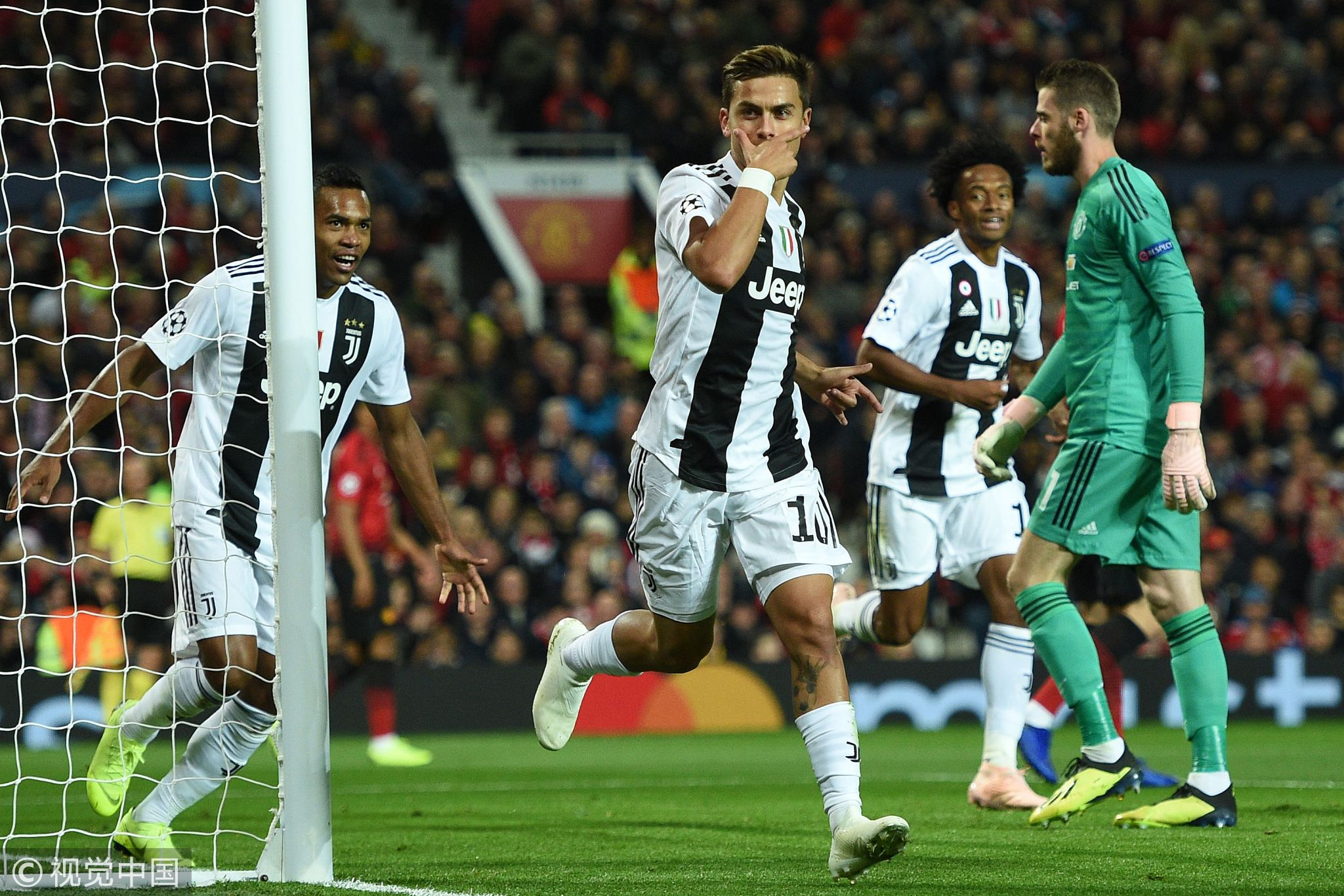 Paulo Dybala (C) celebrates after scoring the opening goal for Juventus in Champions League Group H match between Manchester United and Juventus at Old Trafford, October 23, 2018. /VCG Photo