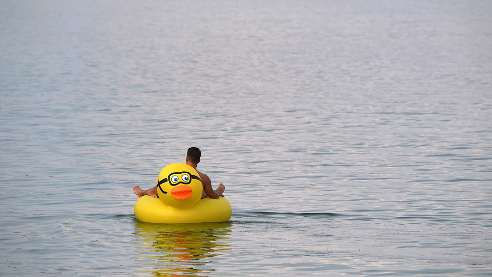 A man sits in a rubber duck in the lake Ammersee near the small Bavarian village of Utting, southern Germany on August 4, 2018. /VCG Photo