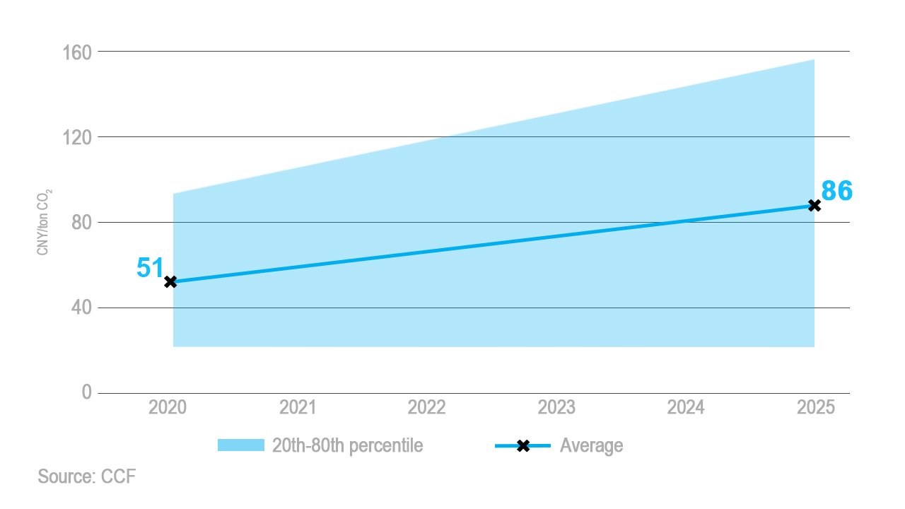Industrialists are expecting a steady rise in carbon price from 51 Yuan in 2020 to 86 Yuan in 2025. /China Carbon Forum Graphics