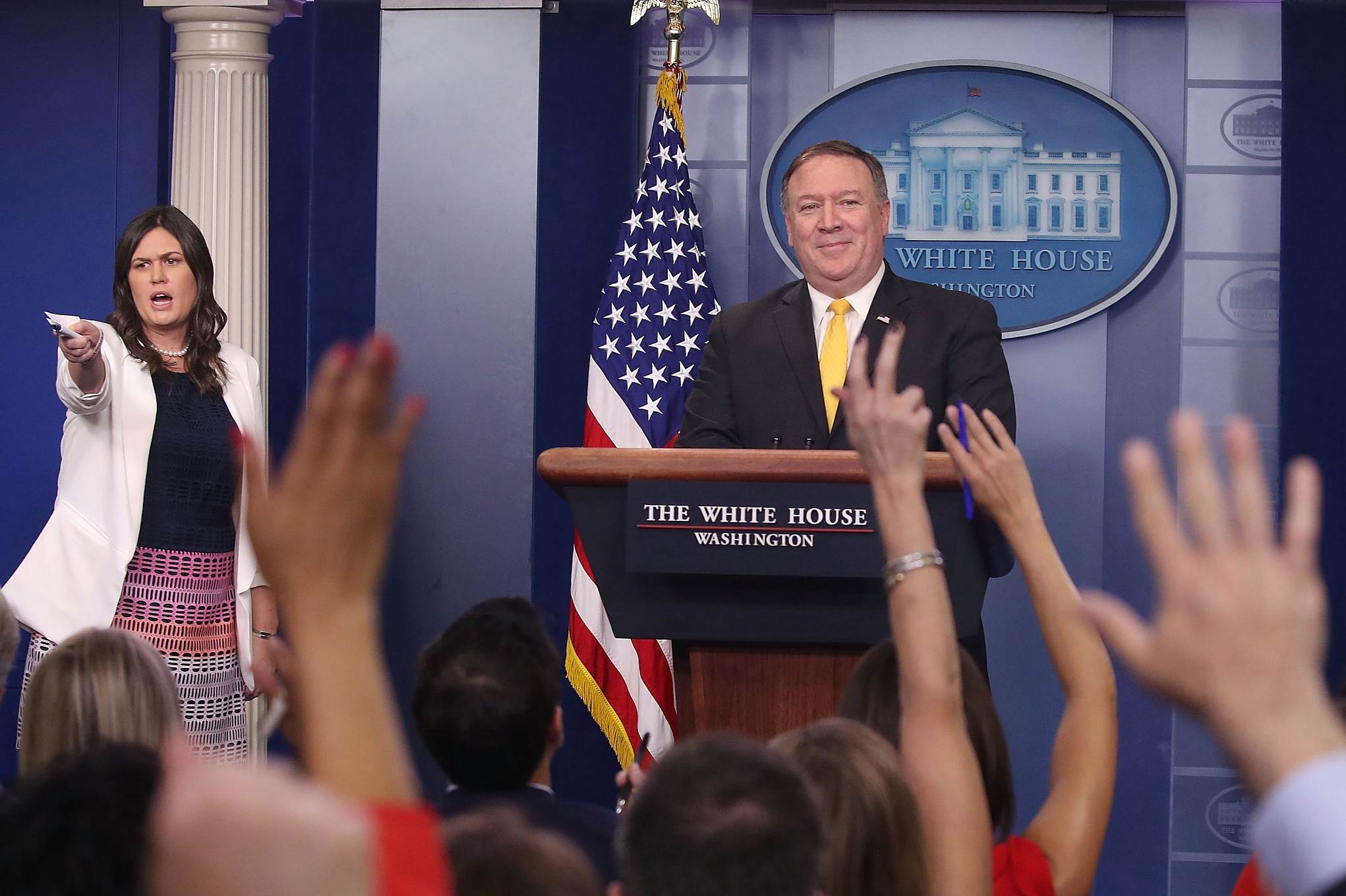 June 7, 2018: White House Spokeswoman Sarah Sanders (L) calls on reporters to ask US Secretary of State Mike Pompeo questions in the Brady Press Briefing Room at the White House. /VCG Photo