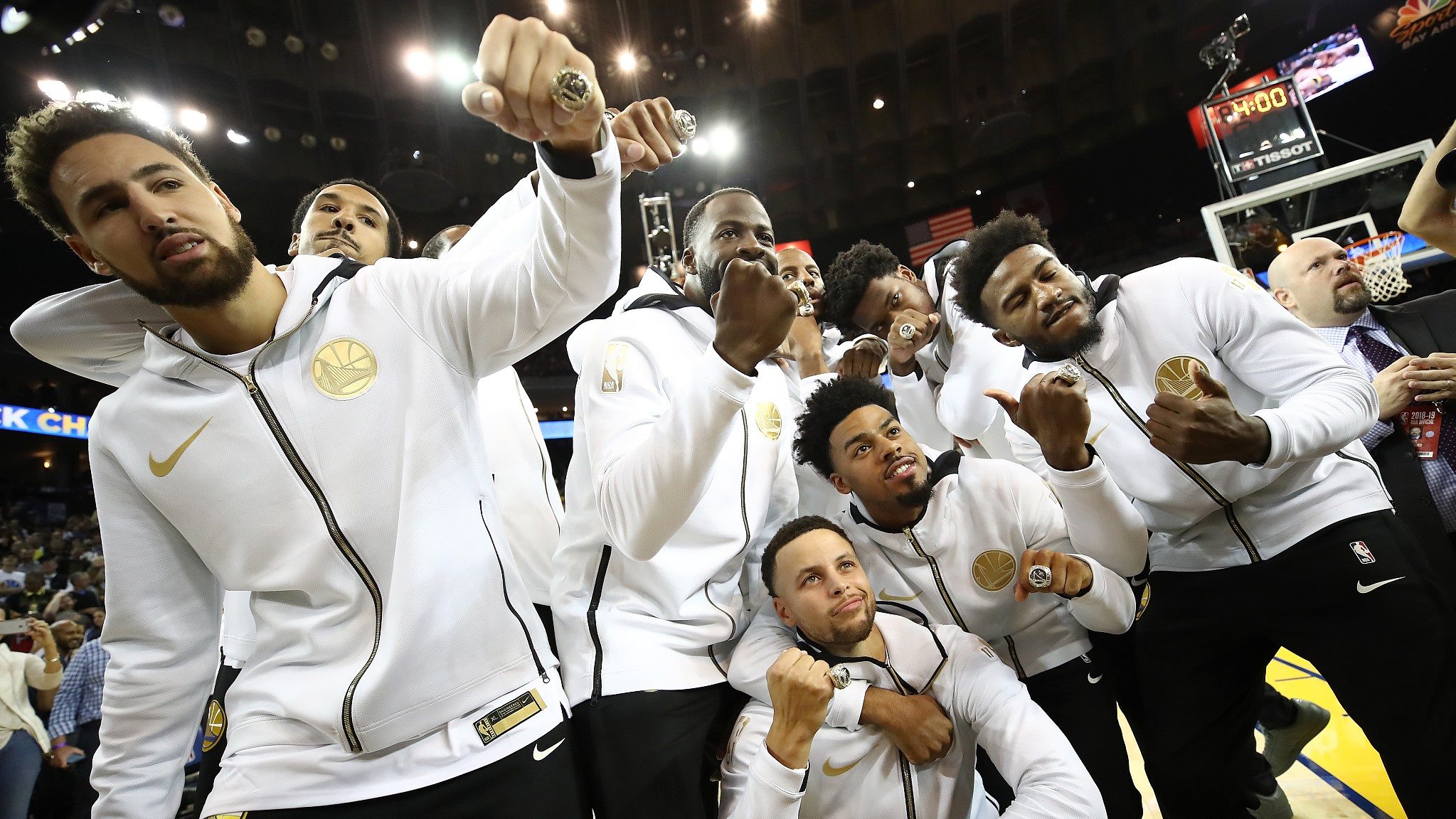 The Golden State Warriors show their 2017-18 championship rings. /VCG Photo