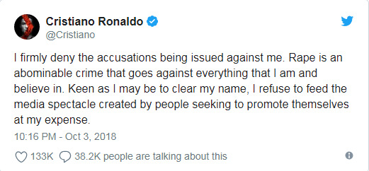 "I firmly deny the accusations being issued against me. Rape is an abominable crime that goes against everything that I am and believe in," the world-famous footballer tweeted on his official page.