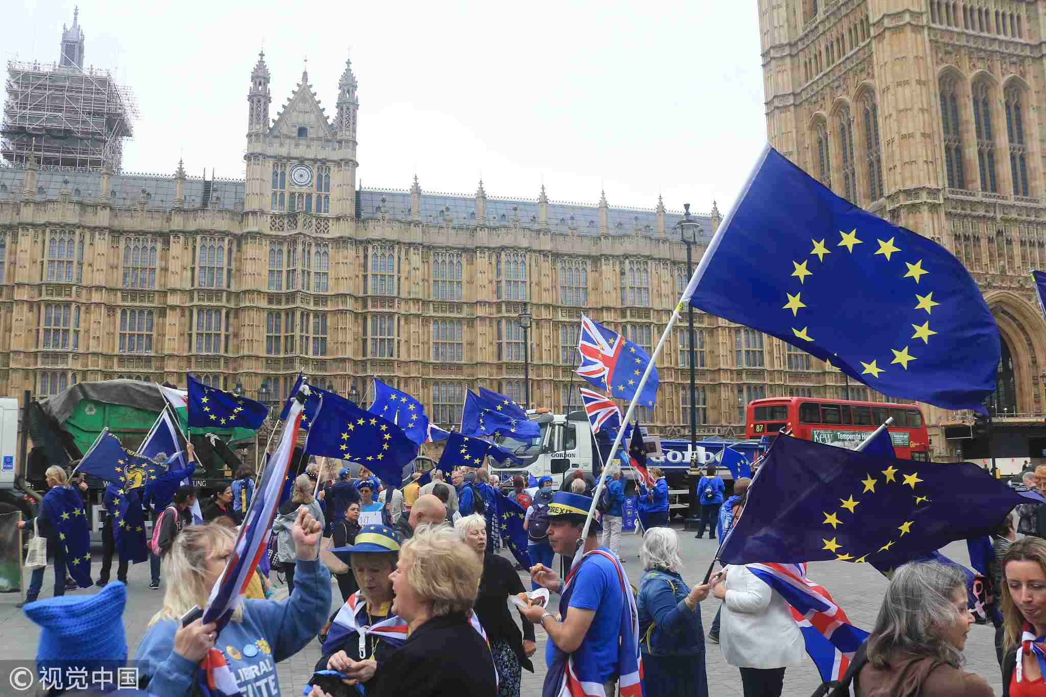 Pro EU remain and Stop Brexit protesters outside Parliament as Members of Parliament are set to start voting on amendments to the EU Withdrawal Bill put forward by the House of Lords on June 12, 2018 in London, England. /VCG Photo