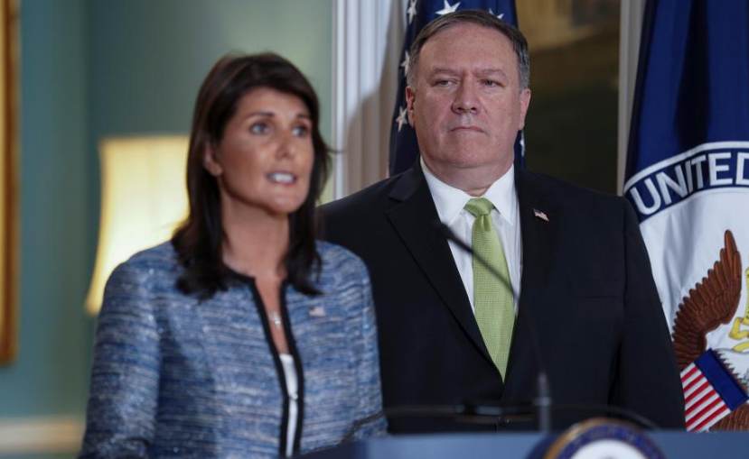 US Ambassador to the United Nations Nikki Haley talks to the press together with US Secretary of State Mike Pompeo, announcing US's withdrawal from the UN Human Rights Council at the Department of State in Washington, US, June 19, 2018. /Reuters Photo