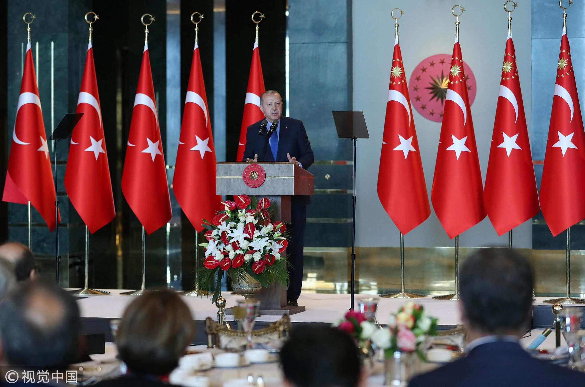 This handout photo was taken and released on August 13, 2018, by the Turkish Presidential Press Service shows Turkish President Recep Tayyip Erdogan addressing a luncheon for participants of the 10th Ambassadors' Conference at the Presidential Complex in Ankara. /VCG Photo.