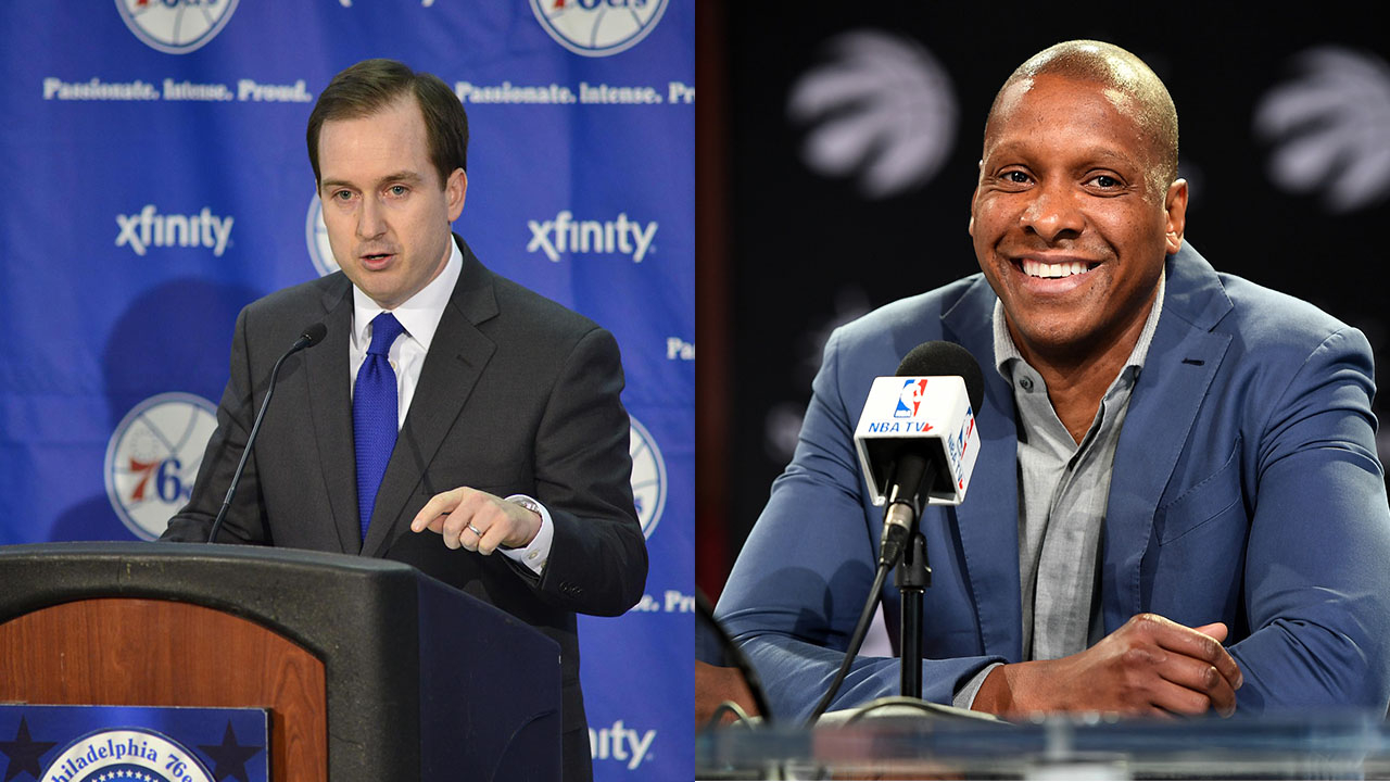 Sam Hinkie (L), the 76ers' former general manager, and Masai Ujiri (R), president of the Toronto Raptors, have been satirized by the secret Twitter accounts linked to Bryan Colangelo. /VCG Photo