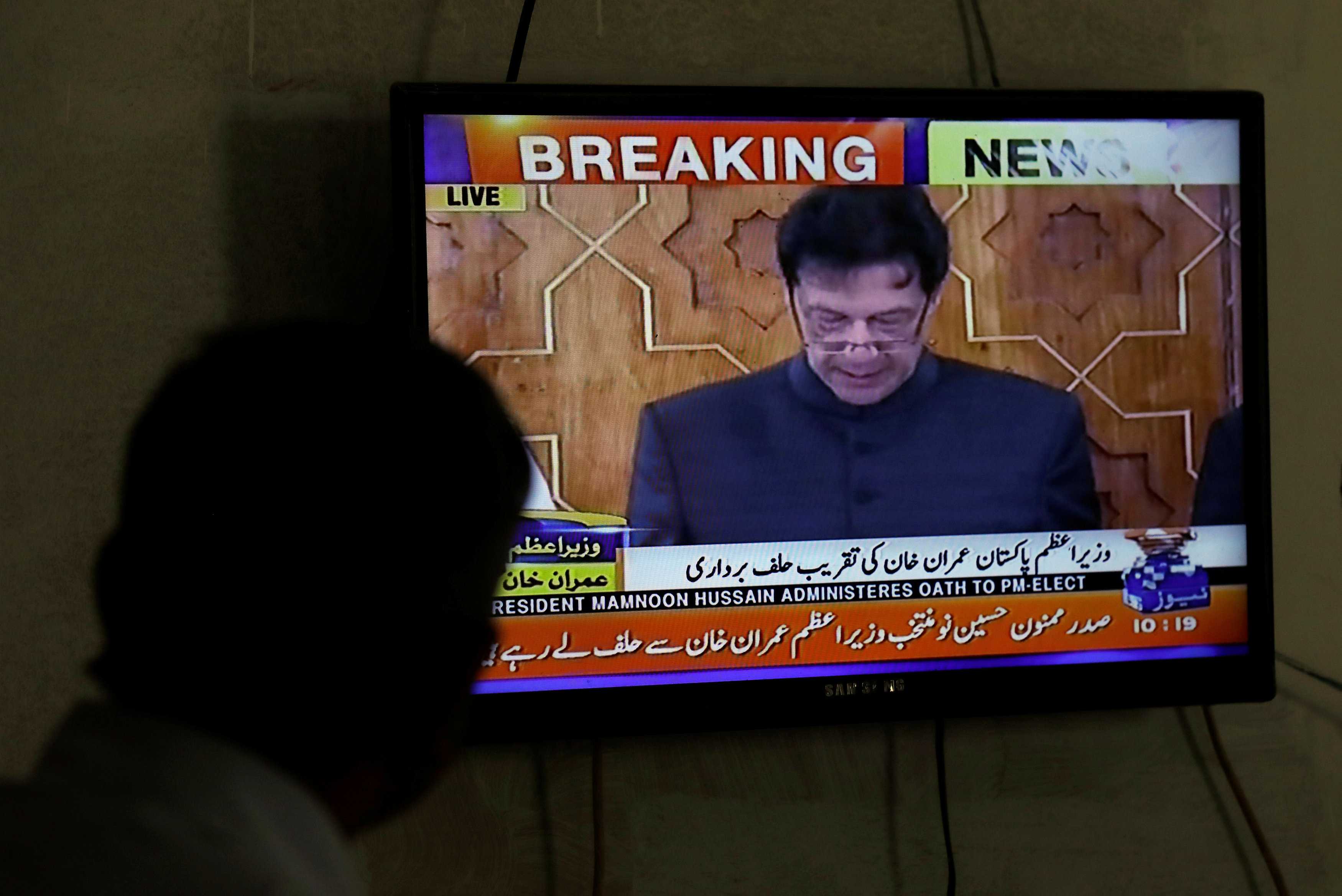 A man looks at a television screen displaying cricketer-turned-politician Imran Khan being sworn in as prime minister of Pakistan, in Karachi, August 18, 2018. /Reuters Photo