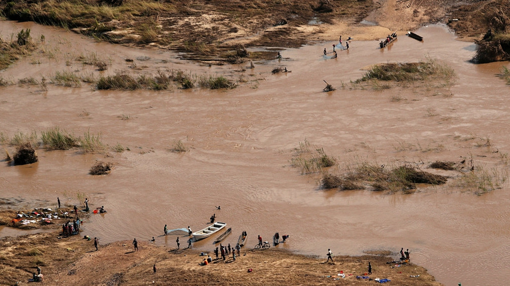 People stand on the banks where the bridge was washed away in the aftermath of Cyclone Idai, near the village of John Segredo, March 24, 2019. /VCG Photo