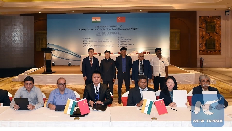 China's trade promotion group and India's Commerce and Industry Ministry attend the signing ceremony of India-China trade cooperation projects in New Delhi, India, March 24, 2018. /Xinhua Photo