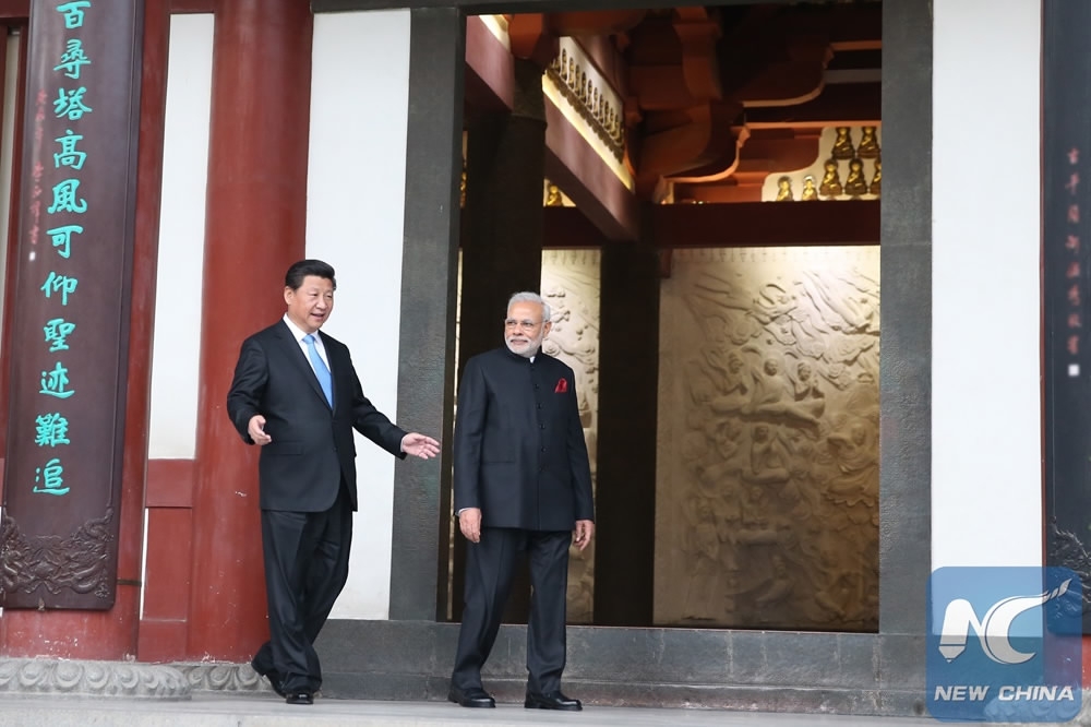 Chinese President Xi Jinping (L) accompanies Indian Prime Minister Narendra Modi to the Da Ci'en Temple after their meeting in Xi'an, northwest China's Shaanxi Province, May 14, 2015. /Xinhua Photo