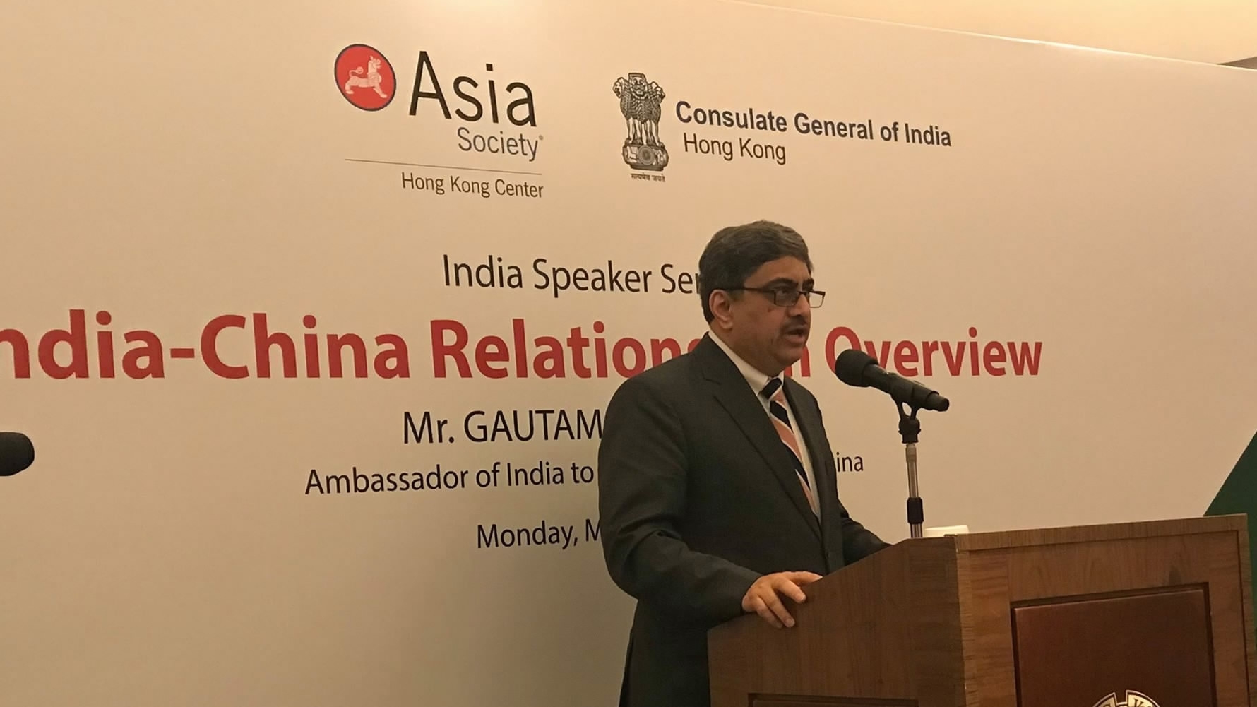 Indian Ambassador to China Gautam Bambawale delivers a talk on "India-China Relations: An Overview" hosted by Asia Society Hong Kong Center, in Hong Kong, China, March 19, 2018. /Photo via Indian Embassy to China