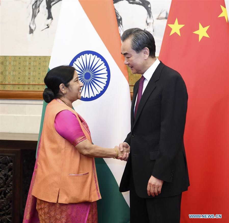 Chinese State Councilor and Foreign Minister Wang Yi (R) holds talks with Indian External Affairs Minister Sushma Swaraj in Beijing, April 22, 2018. /Xinhua Photo