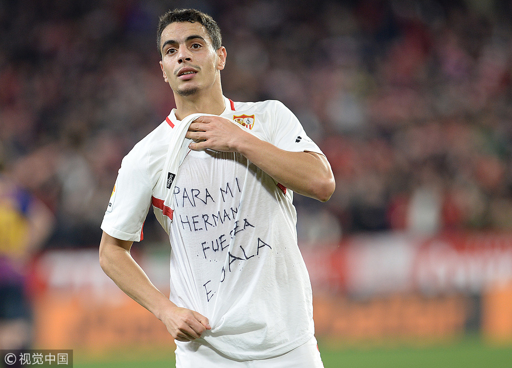 Wissam Ben Yedder of Sevilla FC shows his T-shirt during the first leg match of Copa del Rey Quarter Finals between Sevilla FC and FC Barcelona at Estadio Ramon Sanchez Pizjuan in Seville, Spain, January 23, 2019. /VCG Photo