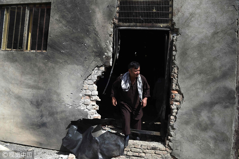 An Afghan wrestler looks on at the entrance gate at the site of a suicide attack, after a blast that targeted wrestlers during a training session at the Maiwand Club, in Kabul, September 6, 2018. /VCG Photo