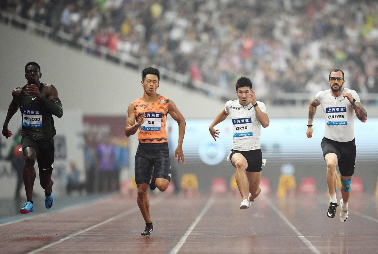 Reece Prescod of Great Britain (L), Xie Zhenye of China, Yoshihide Kiryu of Japan and Ramil Guliyev of Turkey compete during the men's 100m event in Shanghai. /VCG Photo