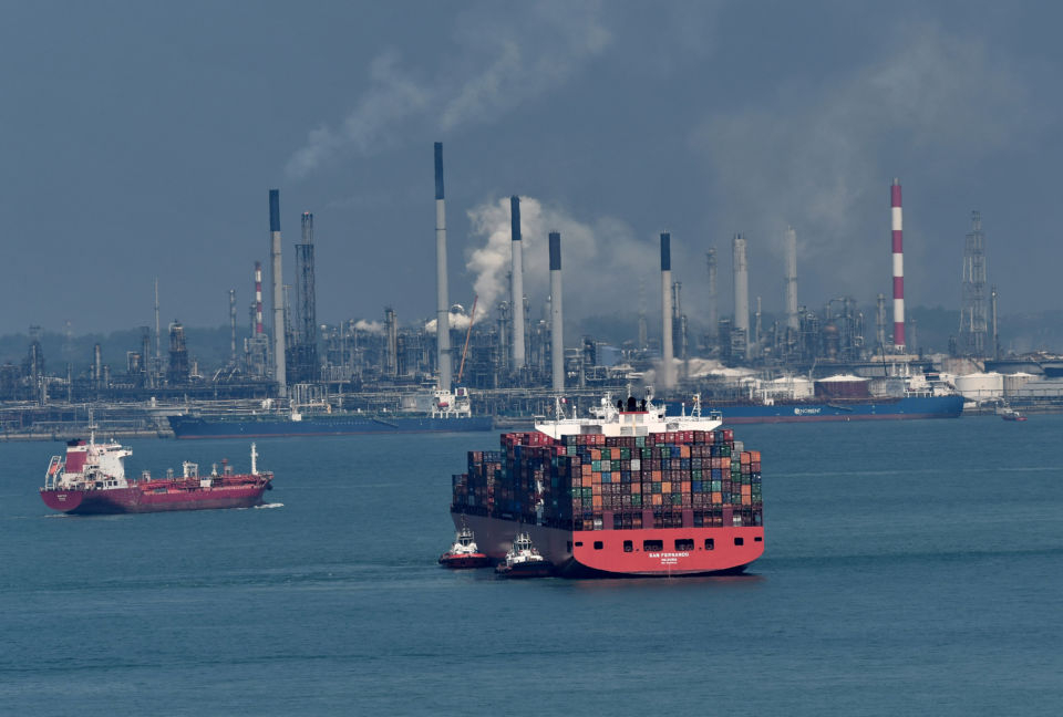 A container vessel guided by a pilot boat sails past Shell's petroleum refineries on Pulau Bukom in Singapore, June 6, 2018. /AFP Photo