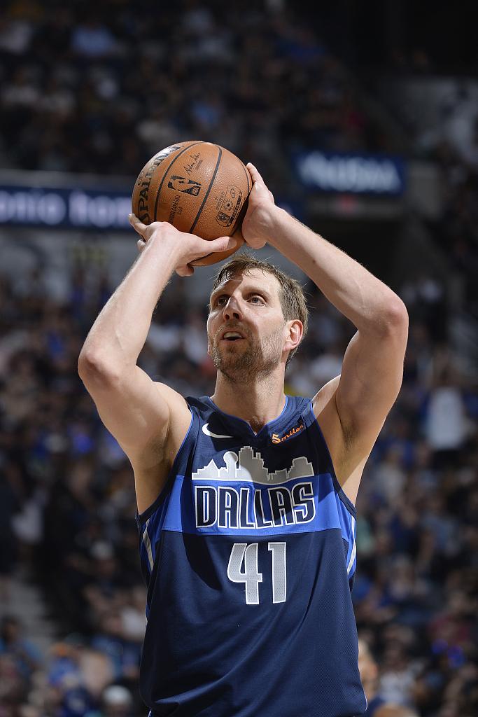 Dirk Nowitzki of the Dallas Mavericks shoots a free throw during the game against the San Antonio Spurs at the AT&T Center in San Antonio, U.S., April 10, 2019. /VCG Photo