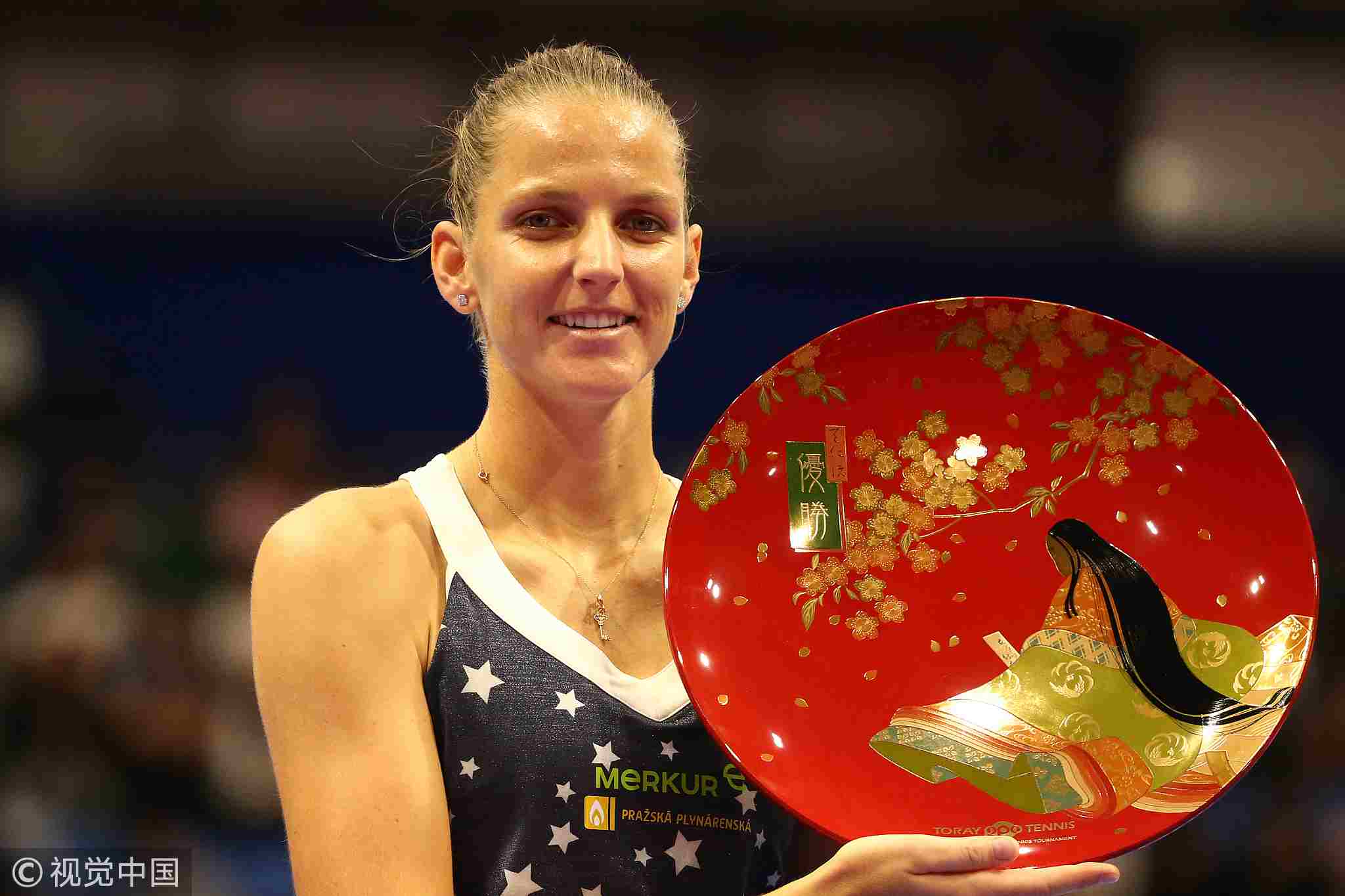 Karolina Pliskova poses with her trophy after winning singles final against Naomi Osaka during the Toray Pan Pacific Open in Tokyo, Japan, September 23, 2018. /VCG Photo