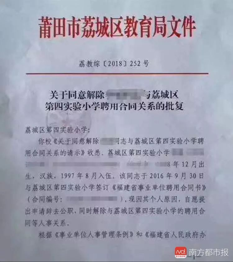 A document circulating online seemingly related to the teacher's dismissal. /Southern Metropolis Daily Photo