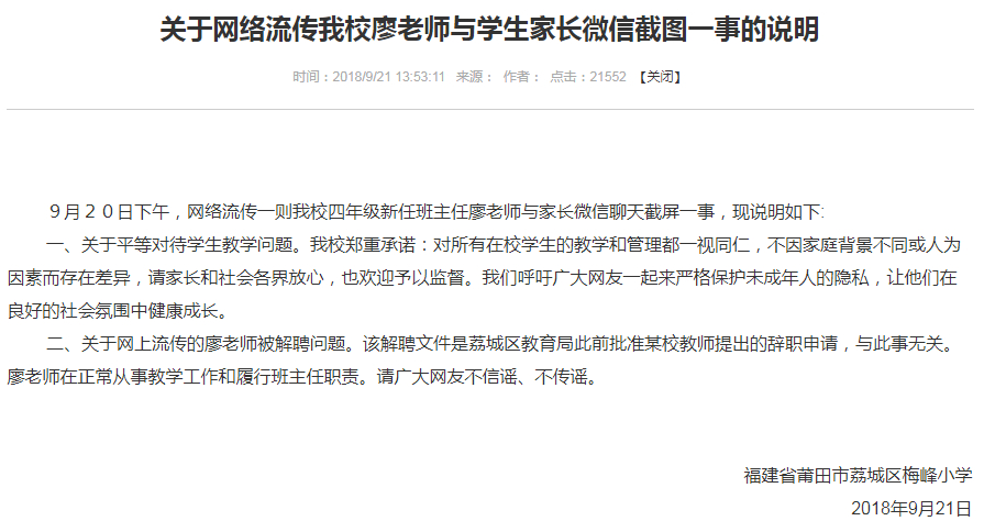 The school also claimed Teacher Liao is performing duties as a head teacher and called for the protection of underage students' privacy.