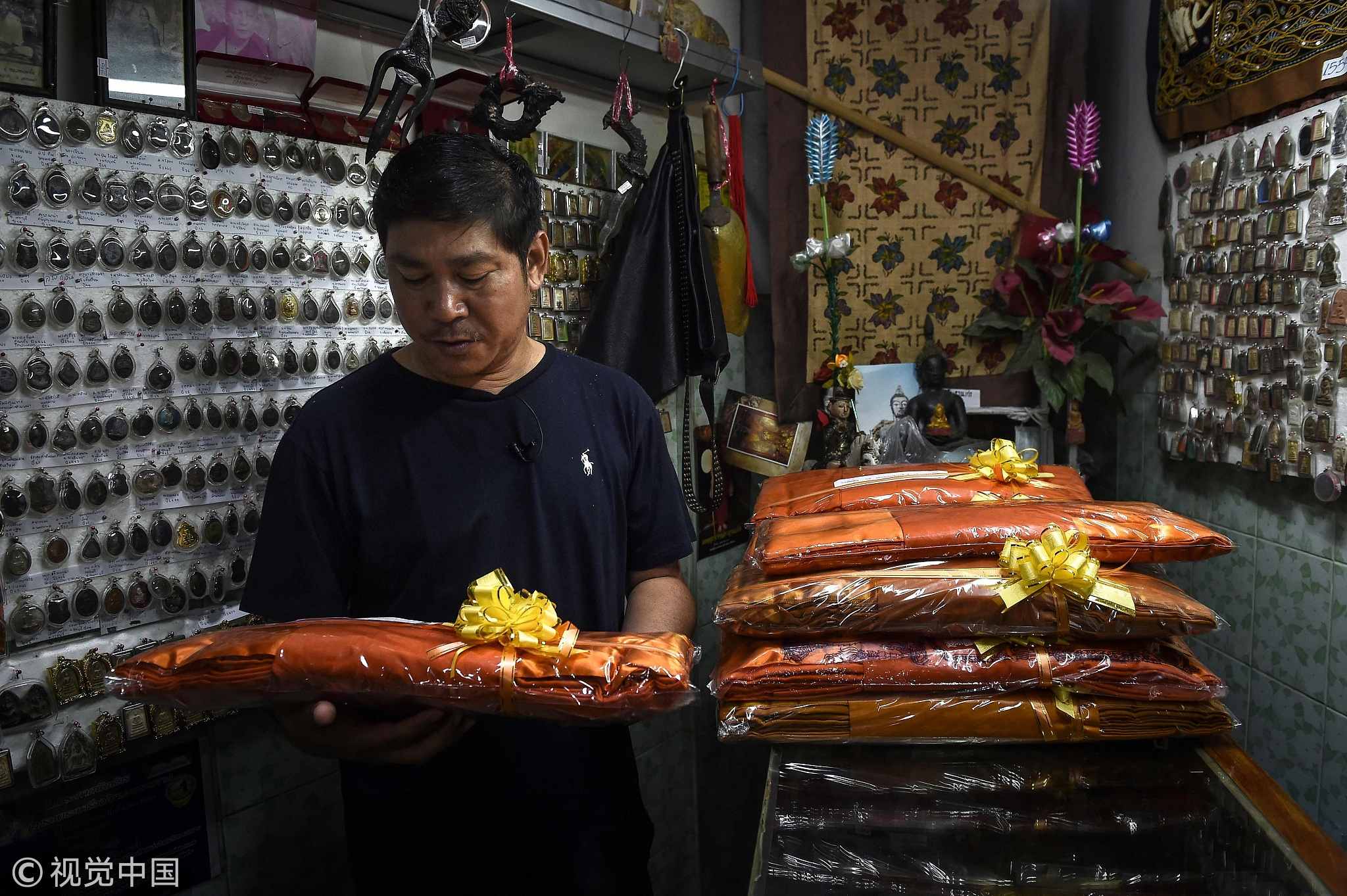 Banphot Promthep, father of young football player Duangphet Promthep (Dom), displays sacred robes gifted by Buddhist monks for the rescued members of the "Wild Boars" football team, as he waits for his son to return home in the Mae Sai district of Chiang Rai province, Thailand, July 18, 2018. /VCG Photo