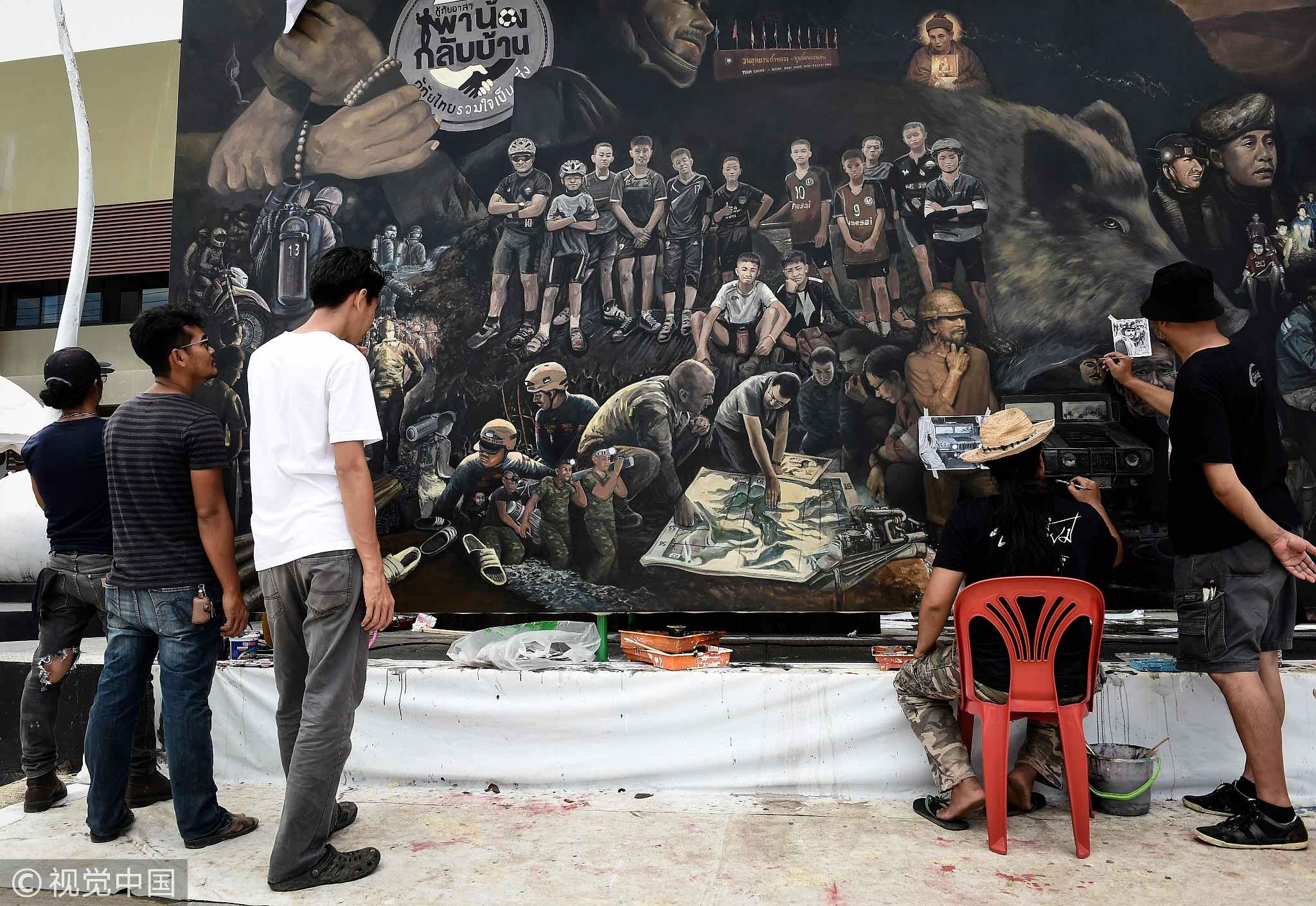 Local artists work on a mural dedicated to the successful rescue of the "Wild Boars" football team outside an art gallery in Chiang Rai province, Thailand, July 18, 2018. /VCG Photo
