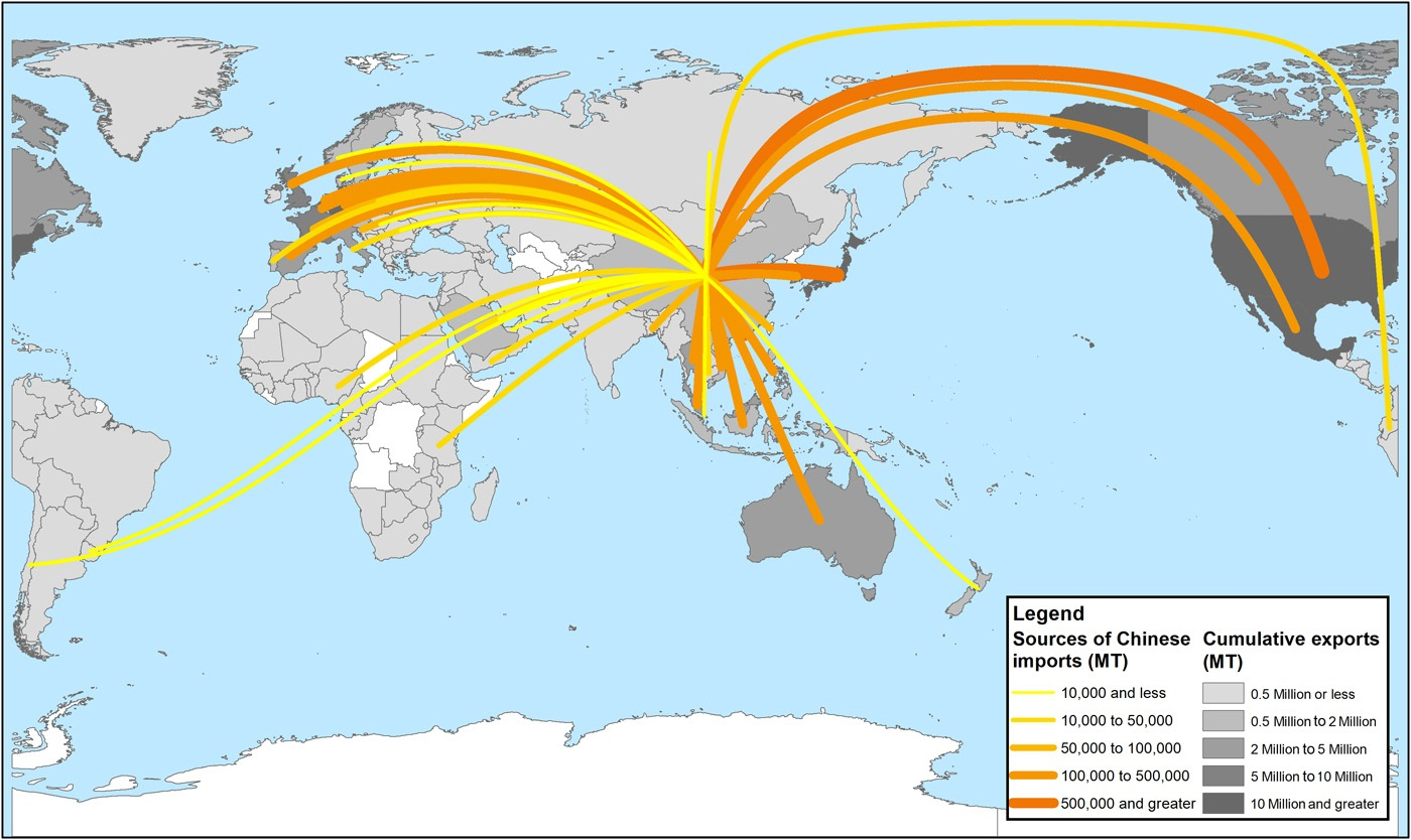 . Sources of plastic waste imports into China in 2016 and cumulative plastic waste export tonnage (in million MT) in 1988–2016. /Science Advances-UGA Graphics