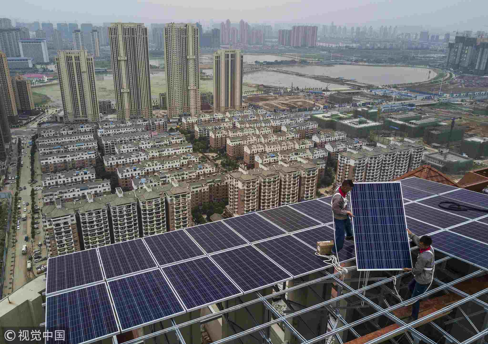 Chinese workers from Wuhan Guangsheng Photovoltaic Company work on a solar panel project on the roof of a 47-story building in a new development in Wuhan, China, on May 14, 2017. /VCG Photo.