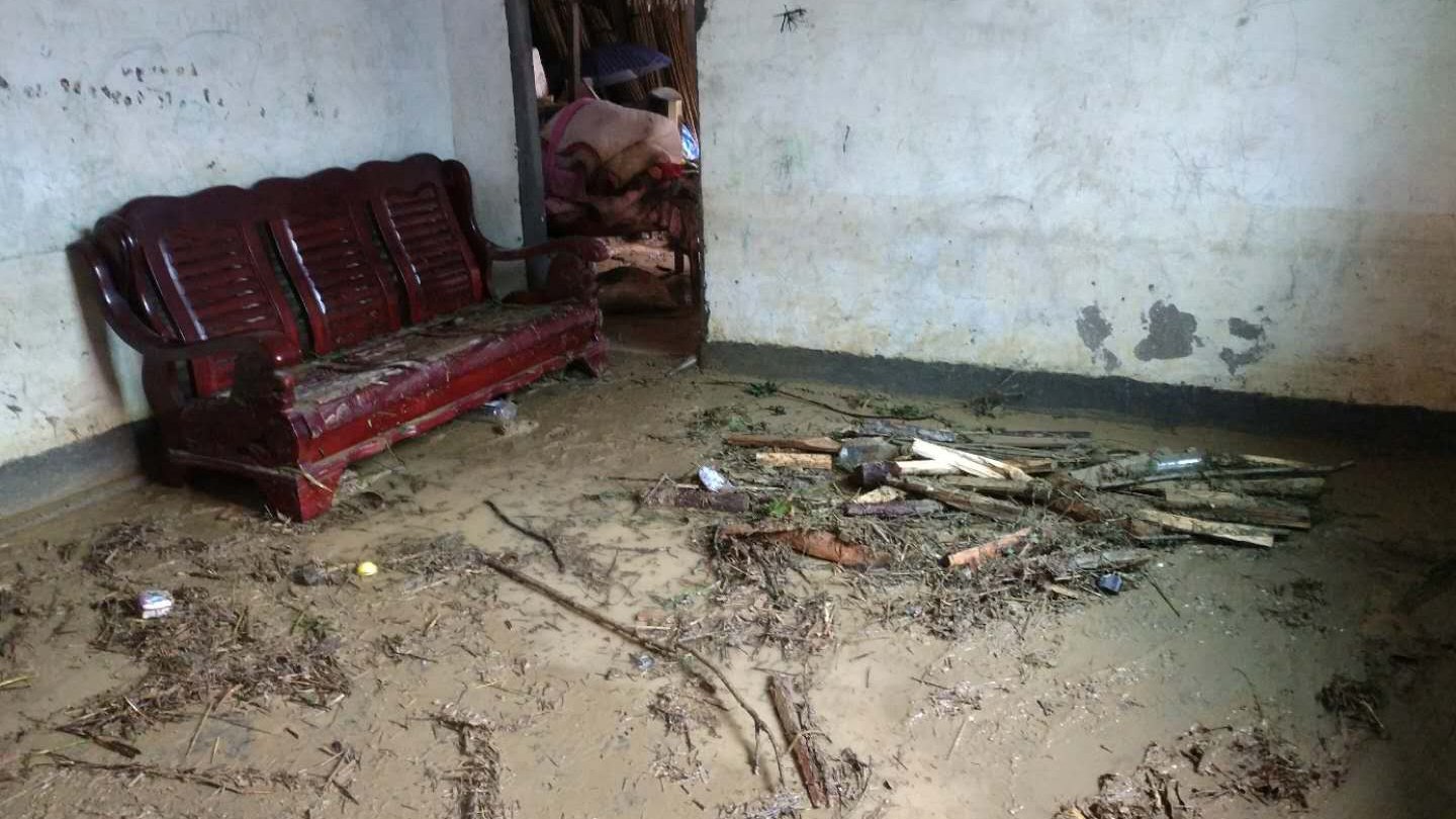 The heavy flood left a watermark 1.5 meters up the wall. /CGTN Photo