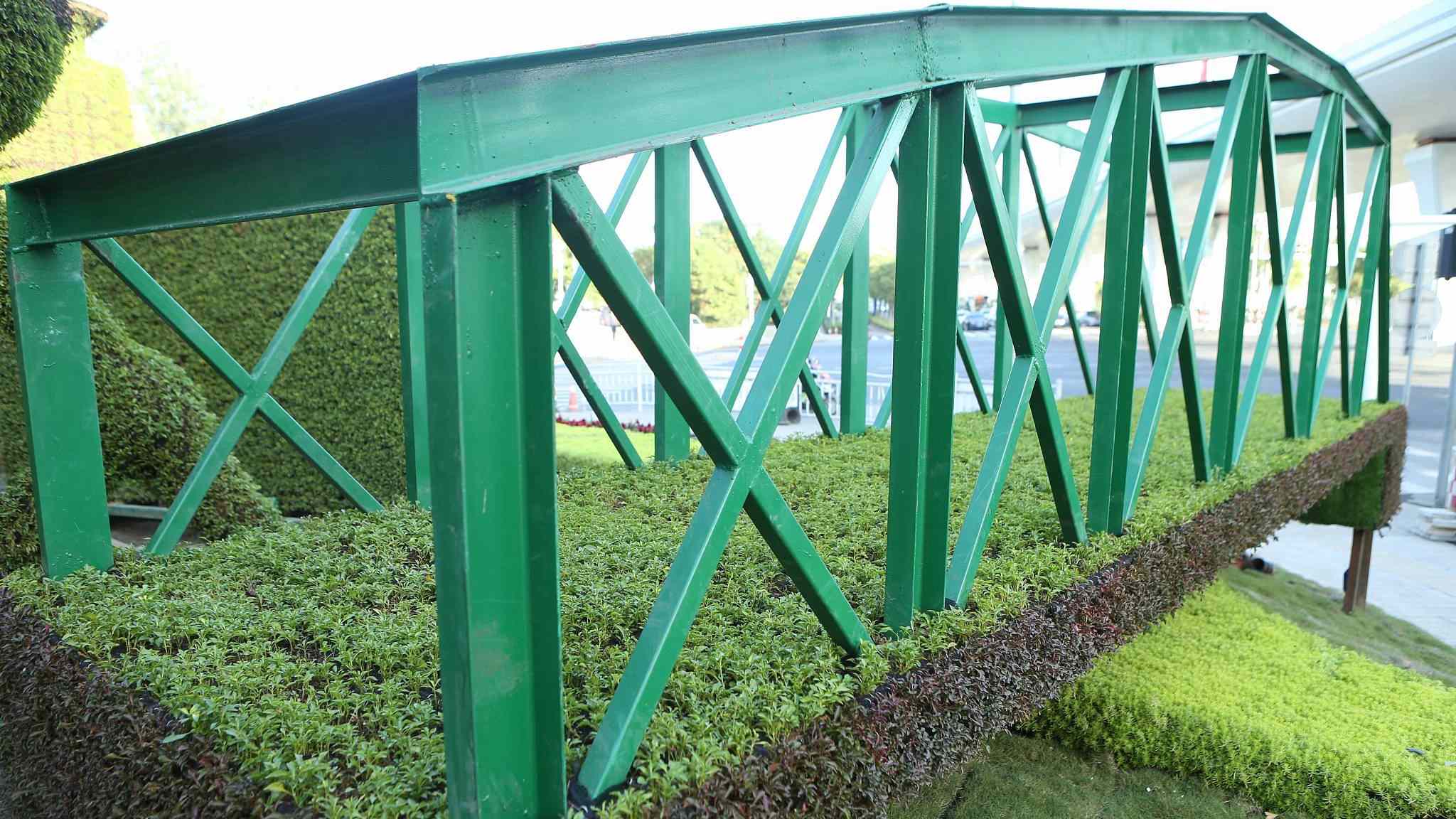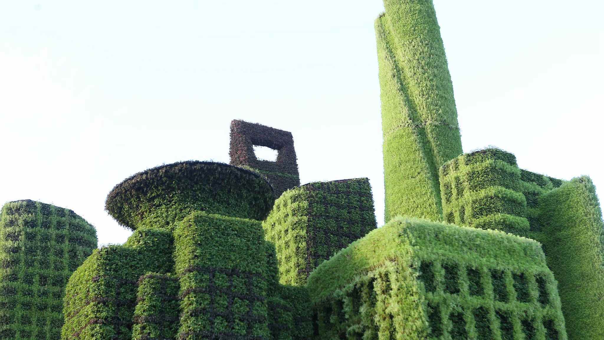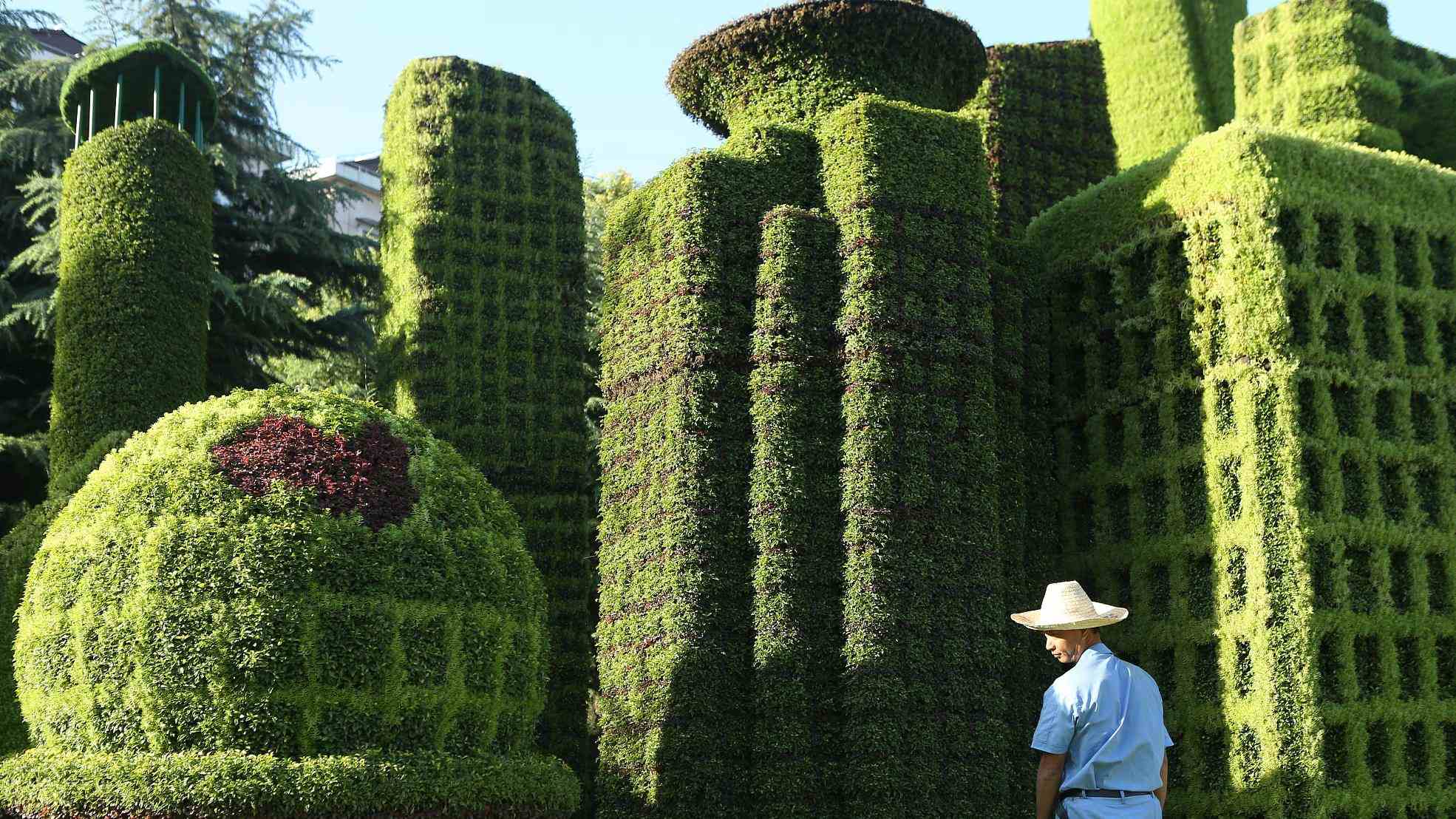 Sculpted hedges resembling Shanghai’s landmarks including the Oriental Pearl Tower, Waibaidu Bridge and Shanghai World Financial Center are seen in the city’s Hongqiao Central Business District (CBD) during the National Day Holiday. /VCG Photo