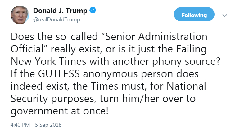 Trump lashed out at both the anonymous author and the New York Times on Twitter.
