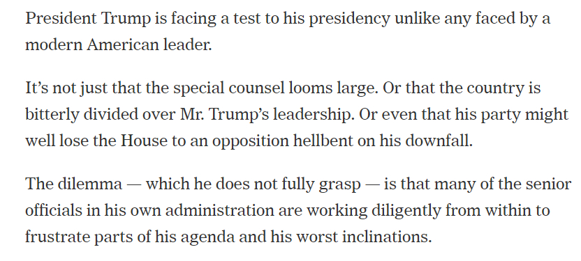 The official piece described a "two-track" presidency in which Trump says one thing and his staff consciously does another.