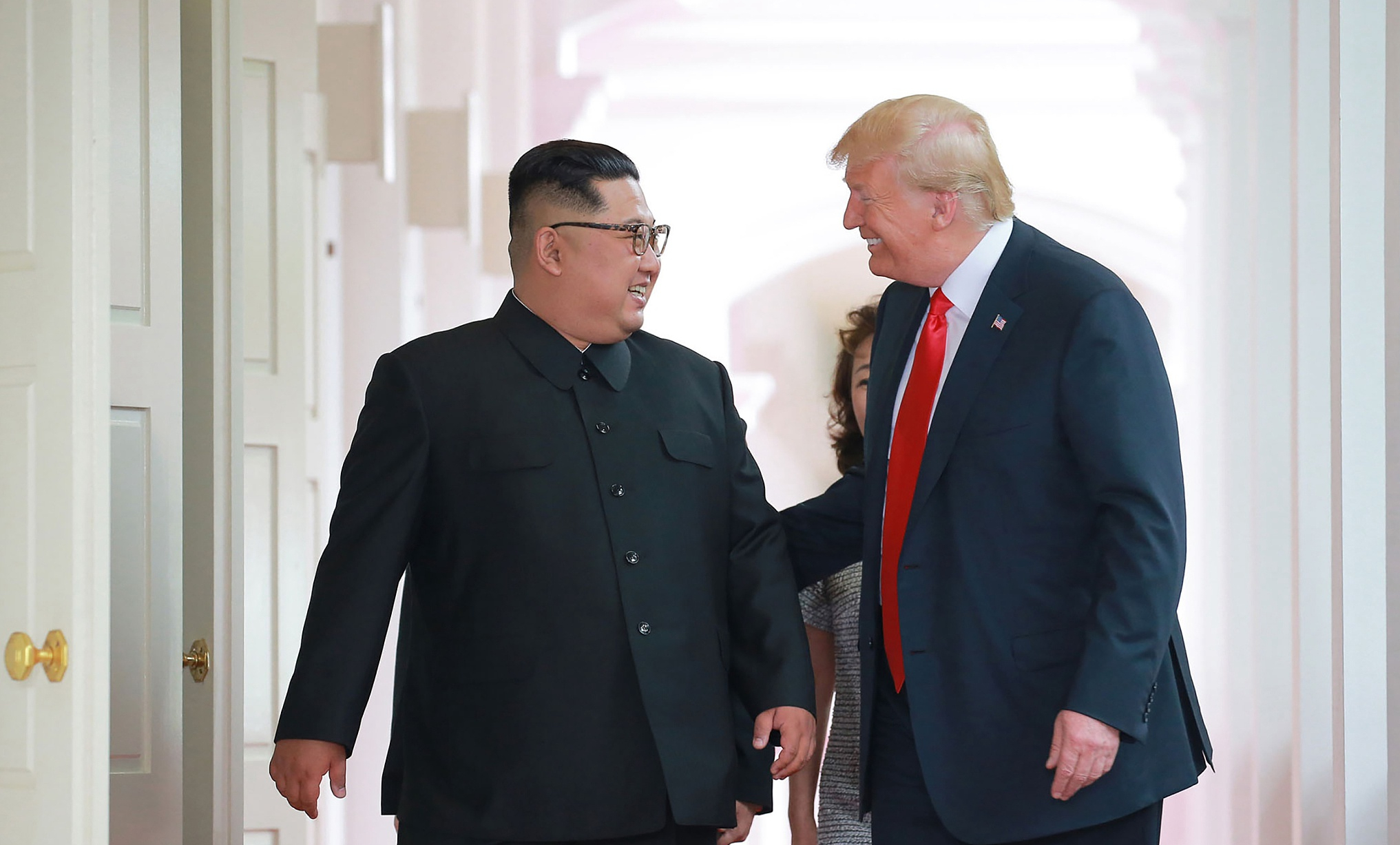June 12, 2018: US President Donald Trump (R) and DPRK leader Kim Jong Un (L) walk to attend their historic summit, at the Capella Hotel on Sentosa island in Singapore. /VCG Photo