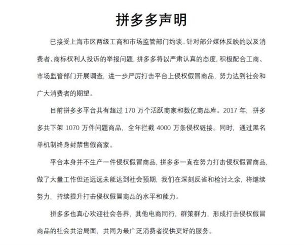 PDD said it will work with authorities to take measures against counterfeit goods in a statement. /Screenshot via Weibo