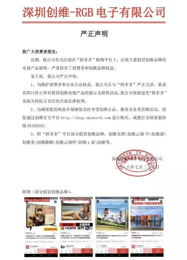 Skyworth demanded PDD remove counterfeit Skyworth-branded products from its platform in a statement. /Screenshot via Weibo