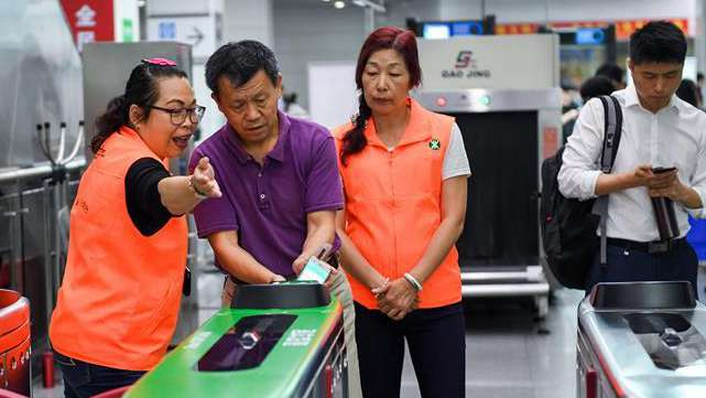 A volunteer helps a passenger use a smartphone-generated QR code to buy a ticket in Shenzhen Metro. /Xinhua Photo