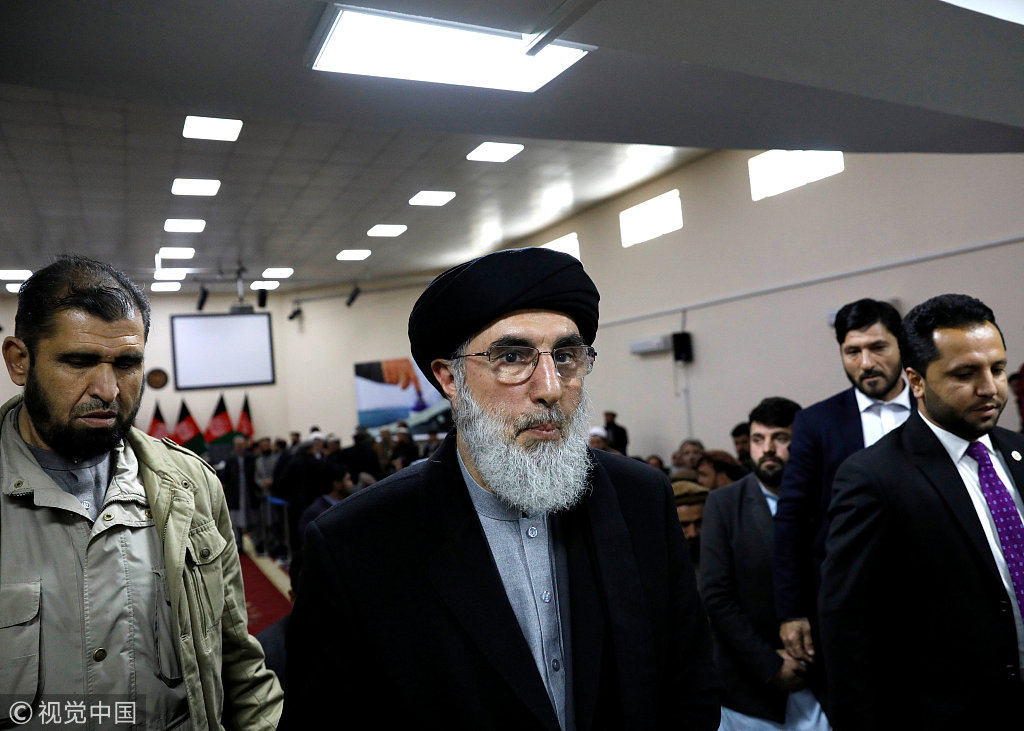 Former Afghan warlord Gulbuddin Hekmatyar (C) leaves after registering as a candidate for the presidential election at Afghanistan's Independent Election Commission (IEC) in Kabul, Afghanistan, January 19, 2019. /VCG Photo